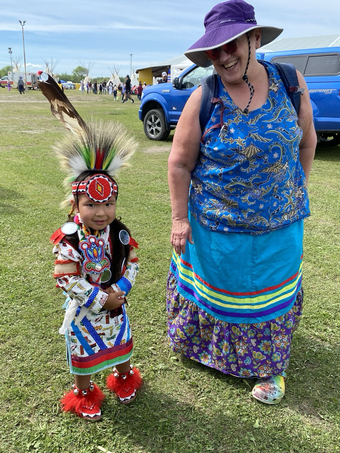 A woman wearing a turquoise ribbon skirt stands next to a tiny pow wow dancer in Batman regalia