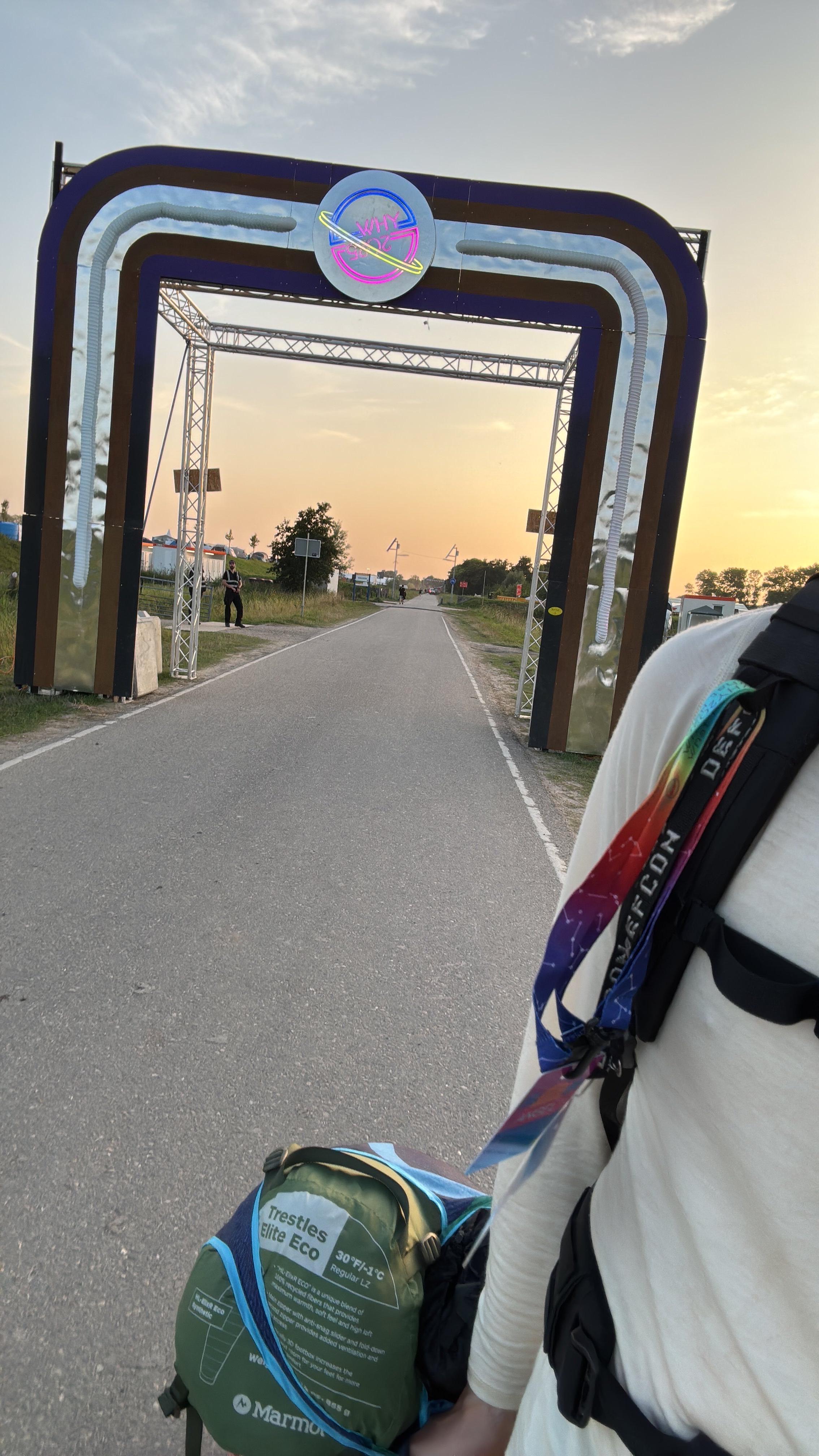 my shoulder, white shirt with backpack strap, walking away from a WHY gate with a sunset in the background