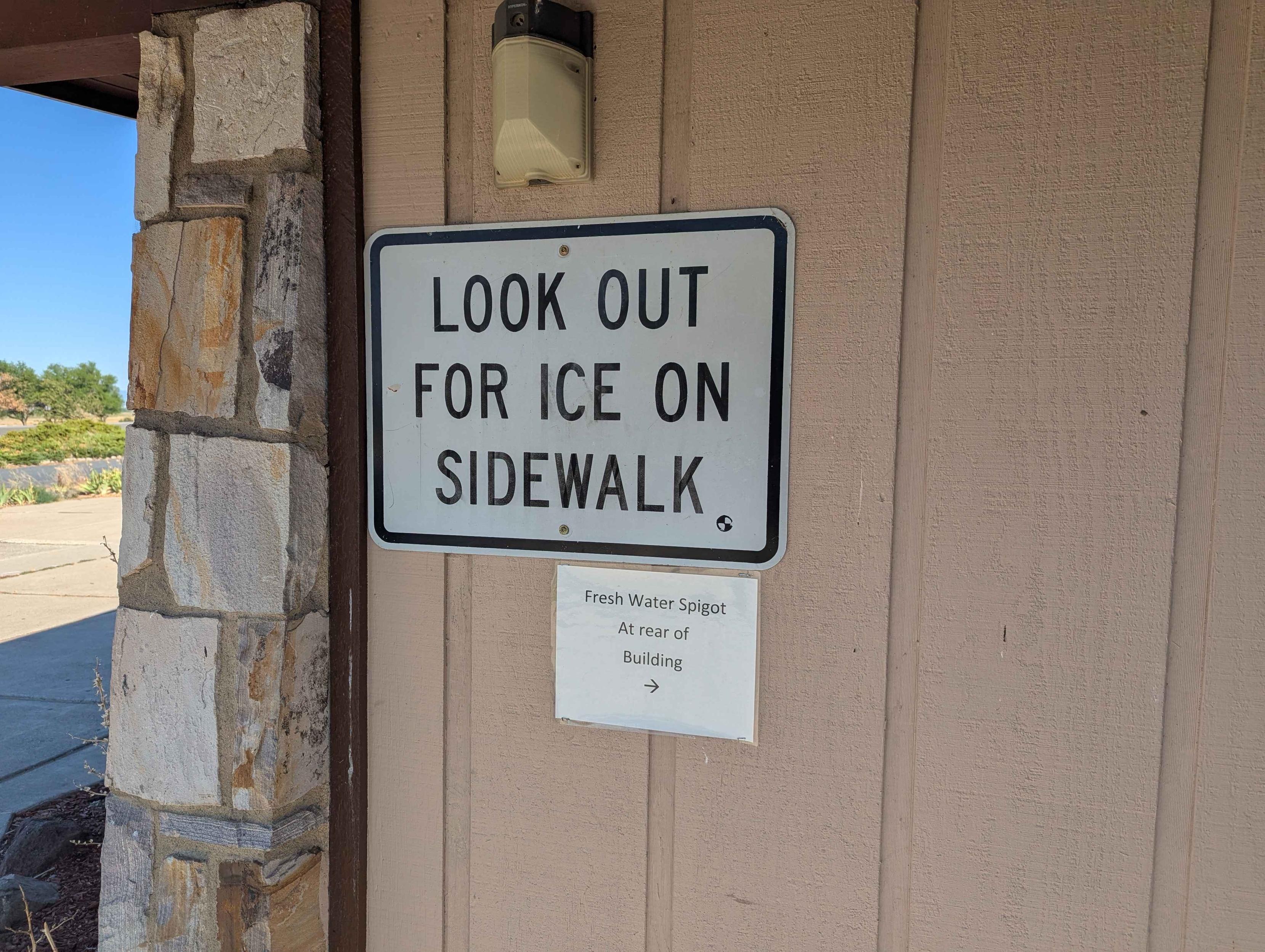 A sign posted on a building warns to "Look Out for Ice on Sidewalk." Below, another sign indicates the location of a fresh water spigot at the rear of the building. The signs are situated against a background of wood and stone.