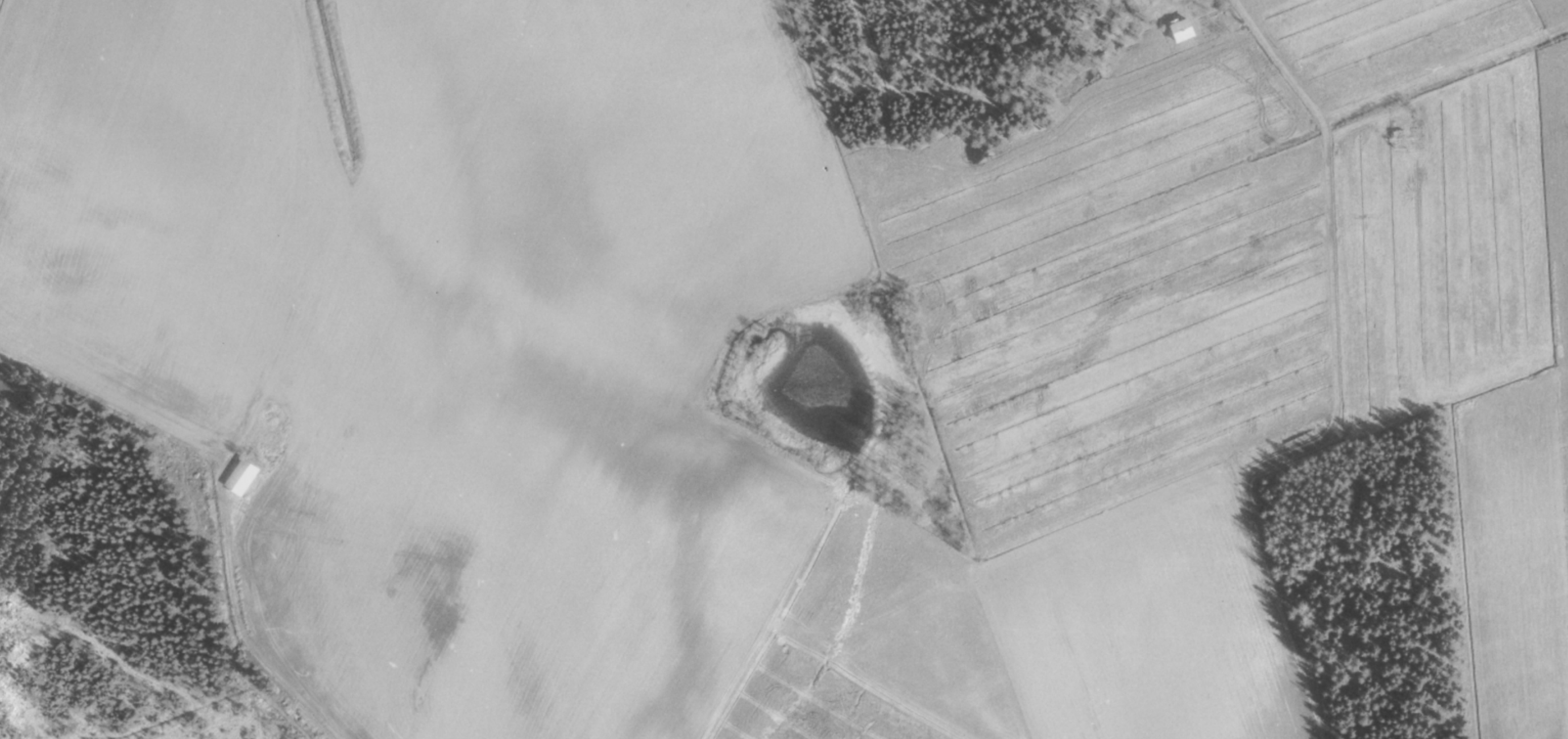Ilmakuva, jossa peltojen keskelle jรครค avoin vesikuoppa.