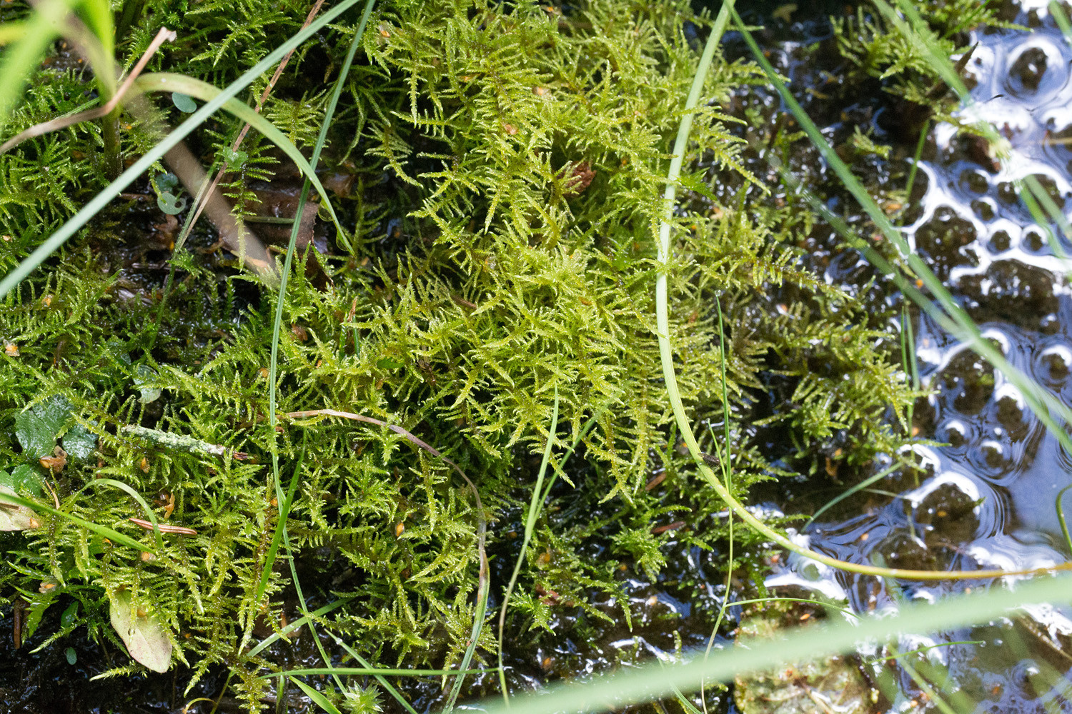 Sirohuurresammal (Cratoneuron filicinum) lรคhteikรถn vedessรค.