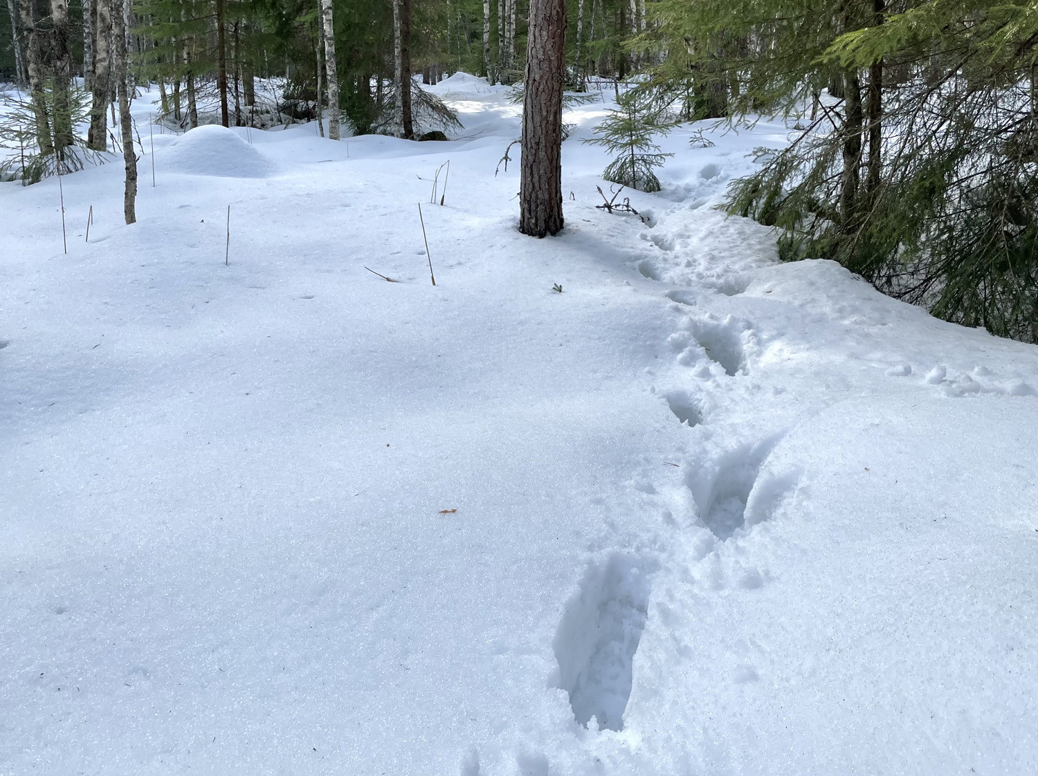 Hangen peittämä puoliavoin metsä, jossa on syvälle lumeen painuneet saappaanjäljet. Taustalla näkyy lumen kokonaan peittämä korkea saramätäs.