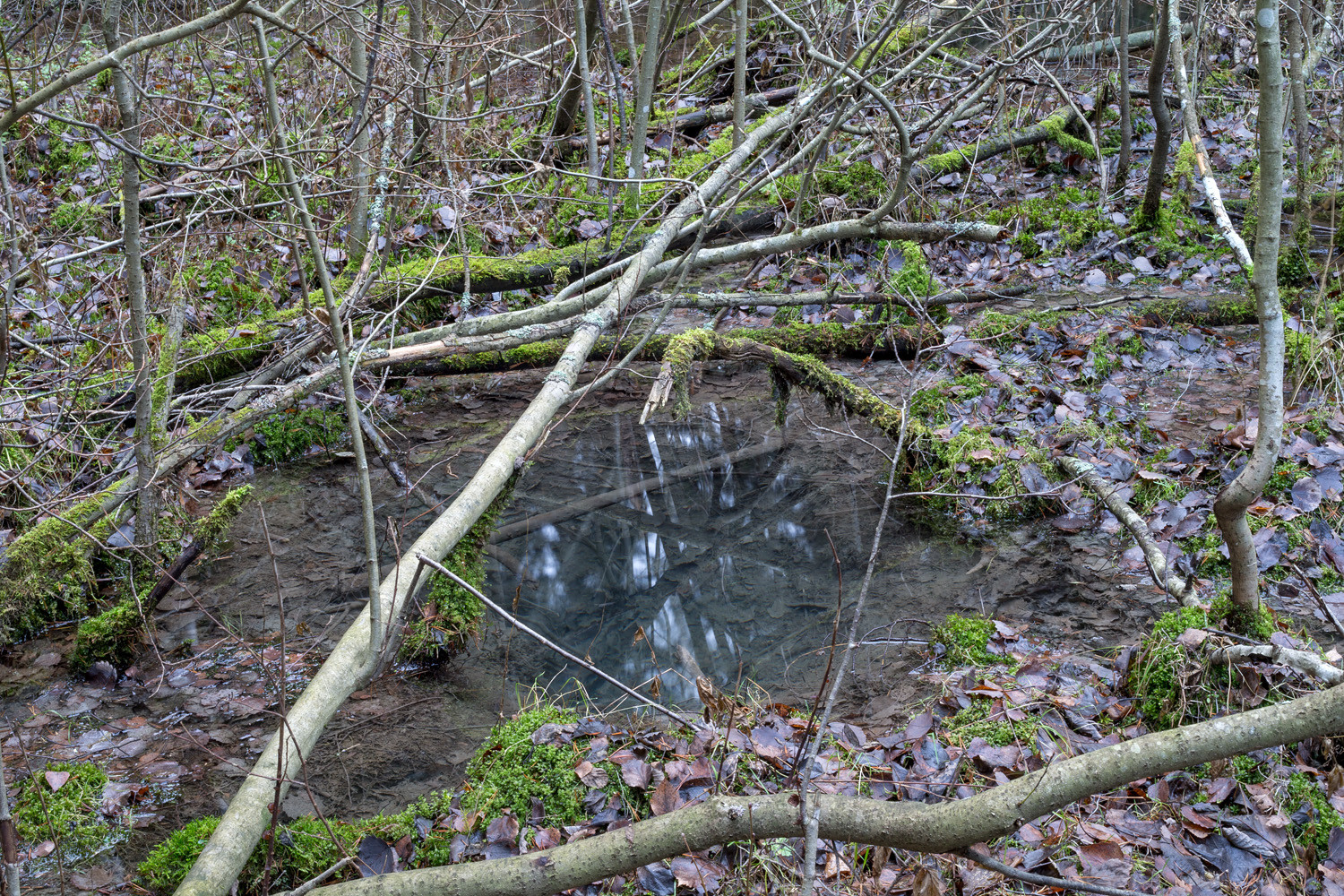 Kirkasvetinen aavistuksen harmahtava lΓ€hdeallikko, josta heijastuu sen ylle kaartuvia lehtipuiden runkoja.