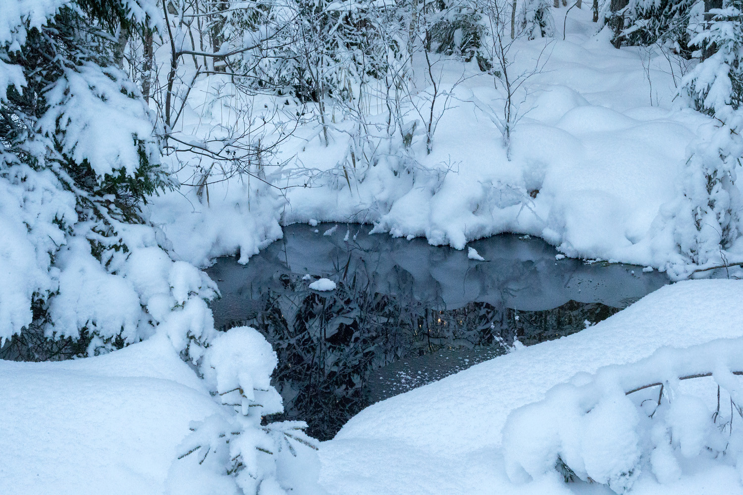 Sula avolähde lumihankien keskellä hämäränä talvipäivänä.