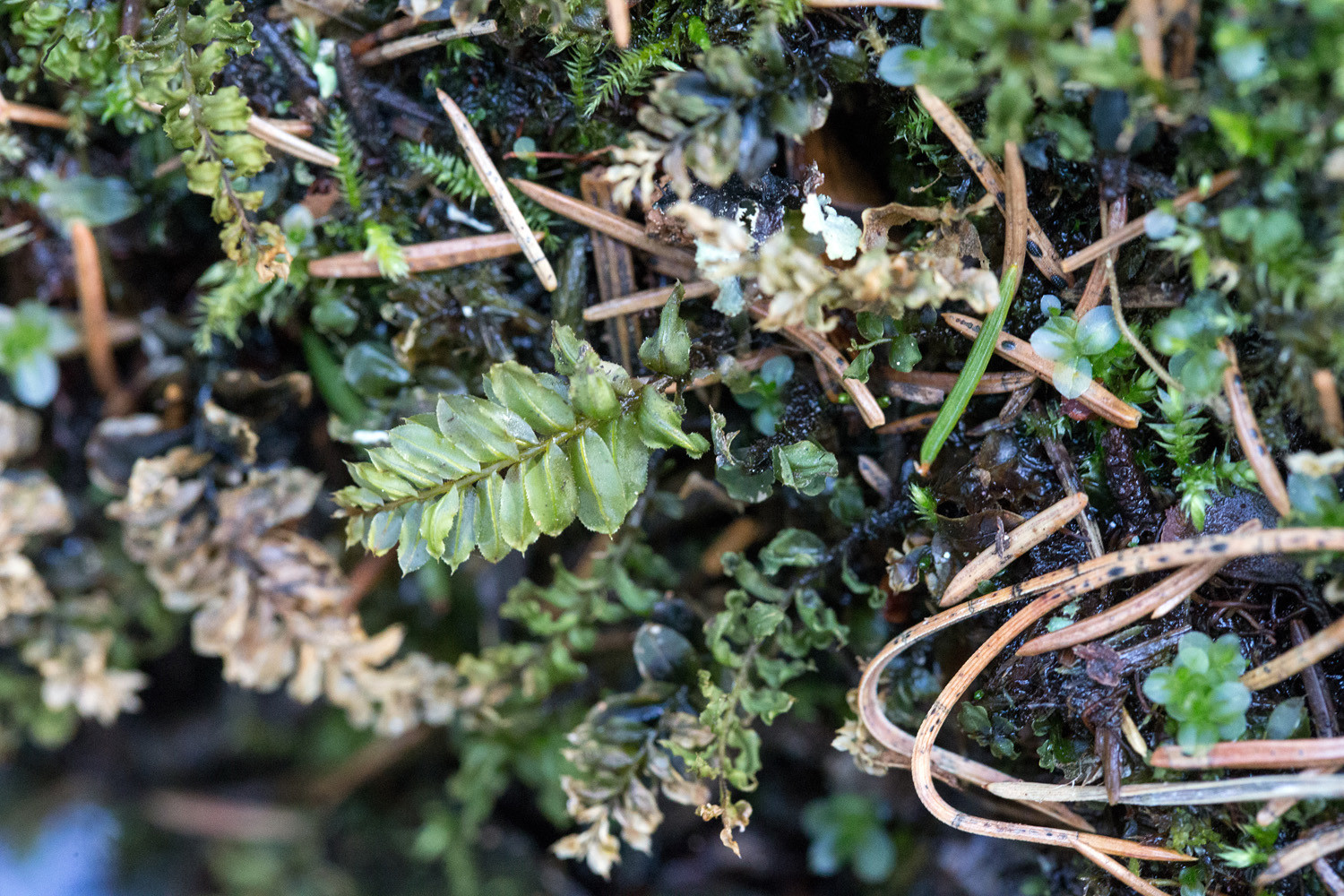 Isokokoisen lehväsammalen kuivahtaneita versoja kuusenneulasten ja muiden sammalten keskellä.