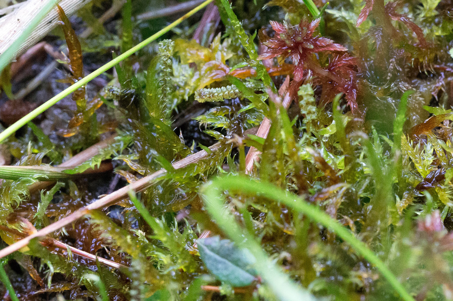 Hetesirppisammalen ym. sotkuinen kasvusto, jonka keskellΓ€ nΓ€kyy kolme rassisammalen (Paludella squarrosa) versoa.