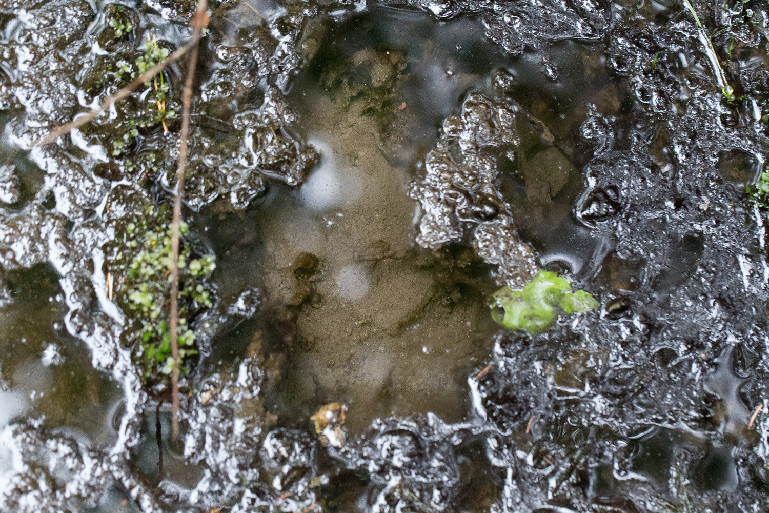 Tihkupintalähteen kasvipeitteetön märkäpinta, jossa on kirkasvetinen pieni lähteensilmä.