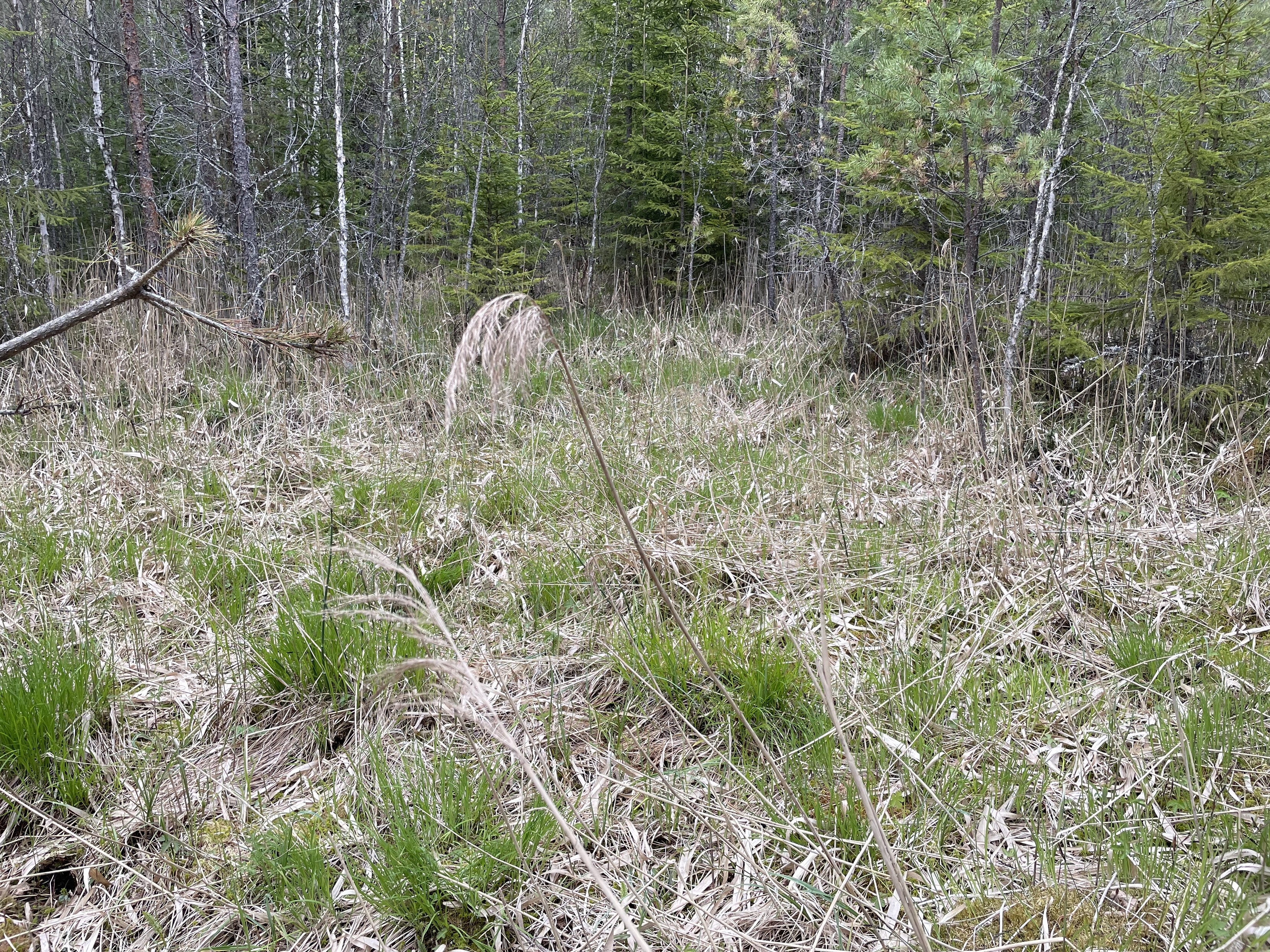 Kuihtunutta järviruokoa ja mätässaraa pienellä aukealla nuoren talousmetsän keskellä.