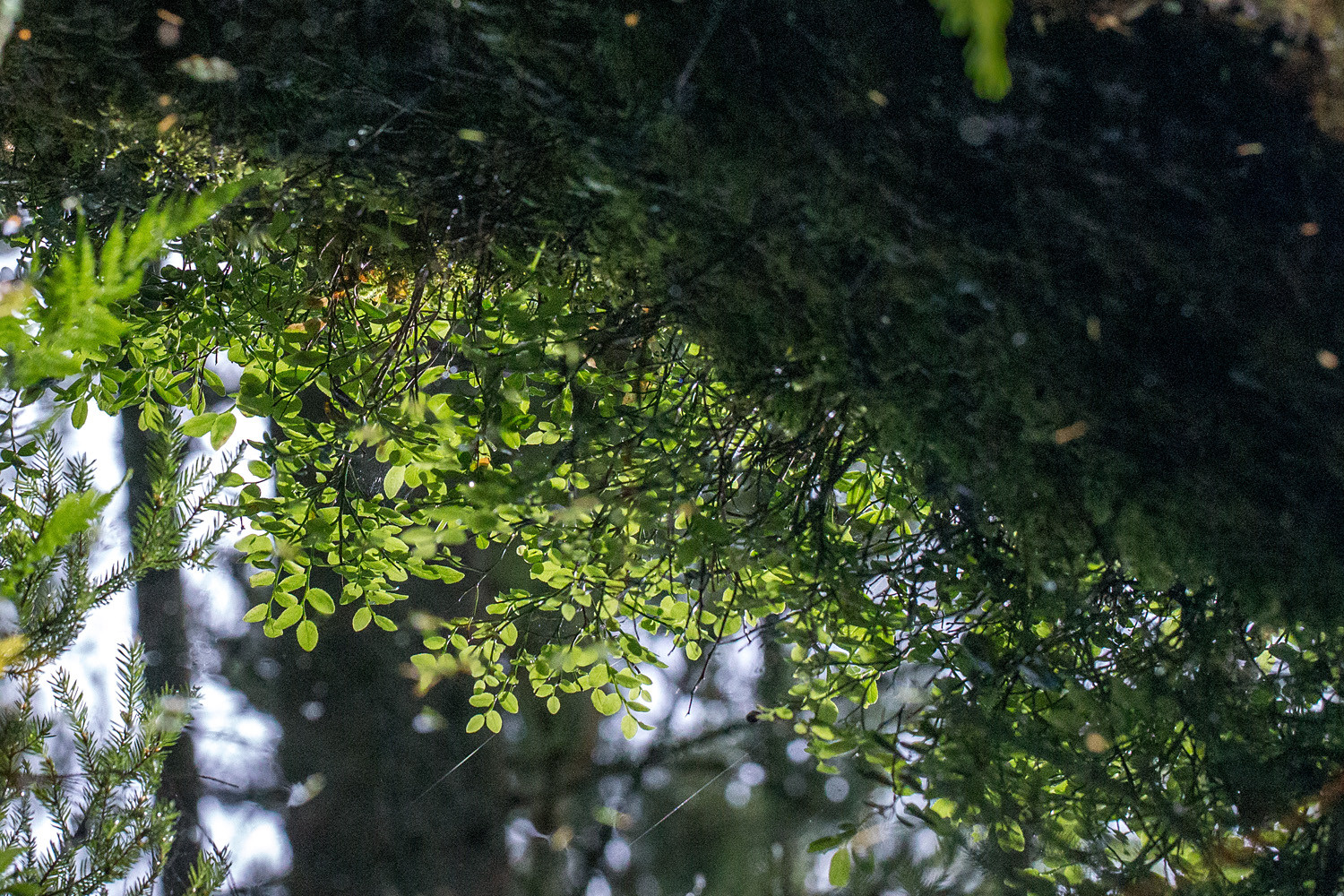 Tyynen veden pinnasta heijastuvia mustikanvarpuja, kuusenoksia ja sammalmΓ€tΓ€stΓ€.