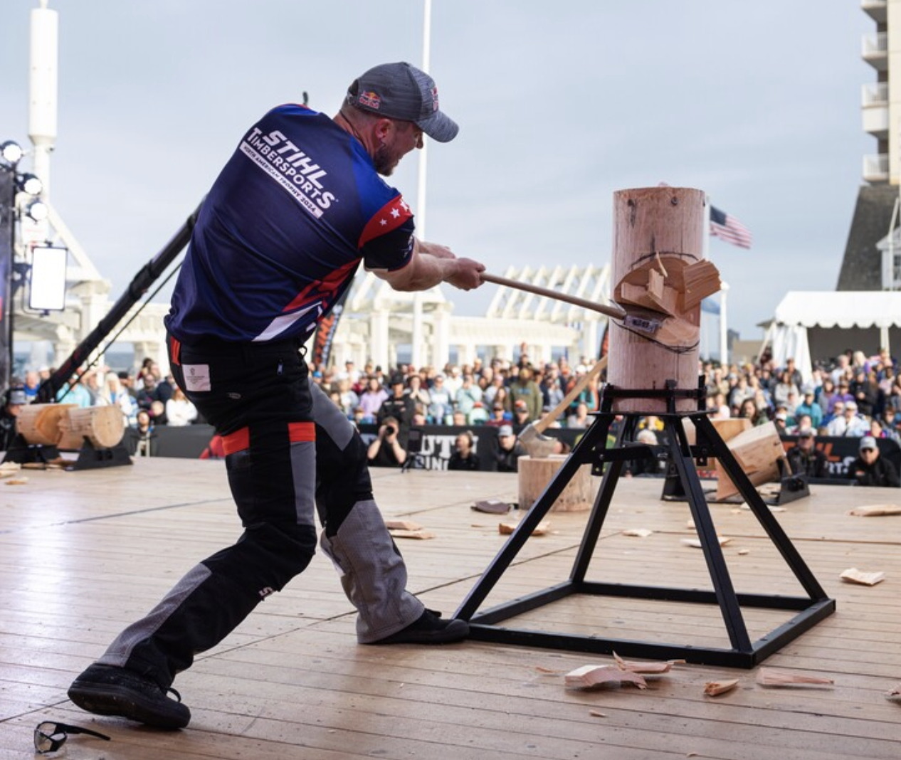 a man chopping a piece of wood that has been placed on some kind of stand, and he is on a stage in front of hundreds of people