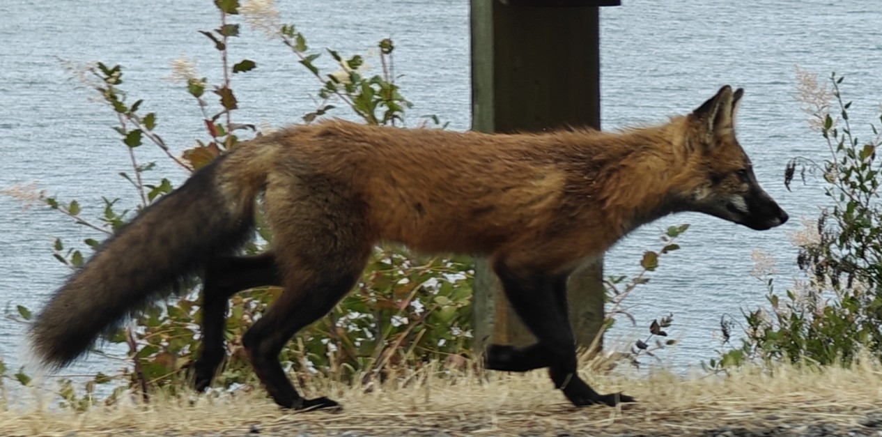 An orange fox with black tail, feet, and muzzle walking along a road in front of an ocean cliff.