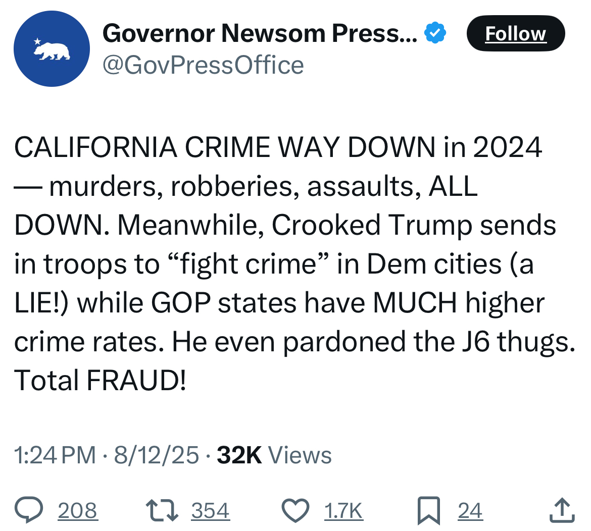 Governor Newsom Press... & Follow @GovPressOffice CALIFORNIA CRIME WAY DOWN in 2024 - murders, robberies, assaults, ALL DOWN. Meanwhile, Crooked Trump sends in troops to "fight crime" in Dem cities (a LIE!) while GOP states have MUCH higher crime rates. He even pardoned the J6 thugs. Total FRAUD! 1:24 PM • 8/12/25 • 32K Views