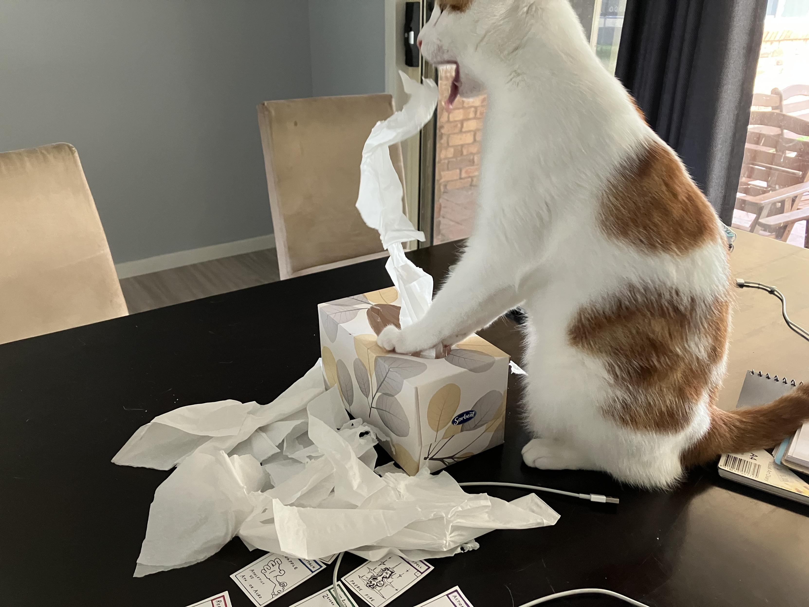 A white and ginger ripping tissues out of a tissue box with their mouth, over and over.
