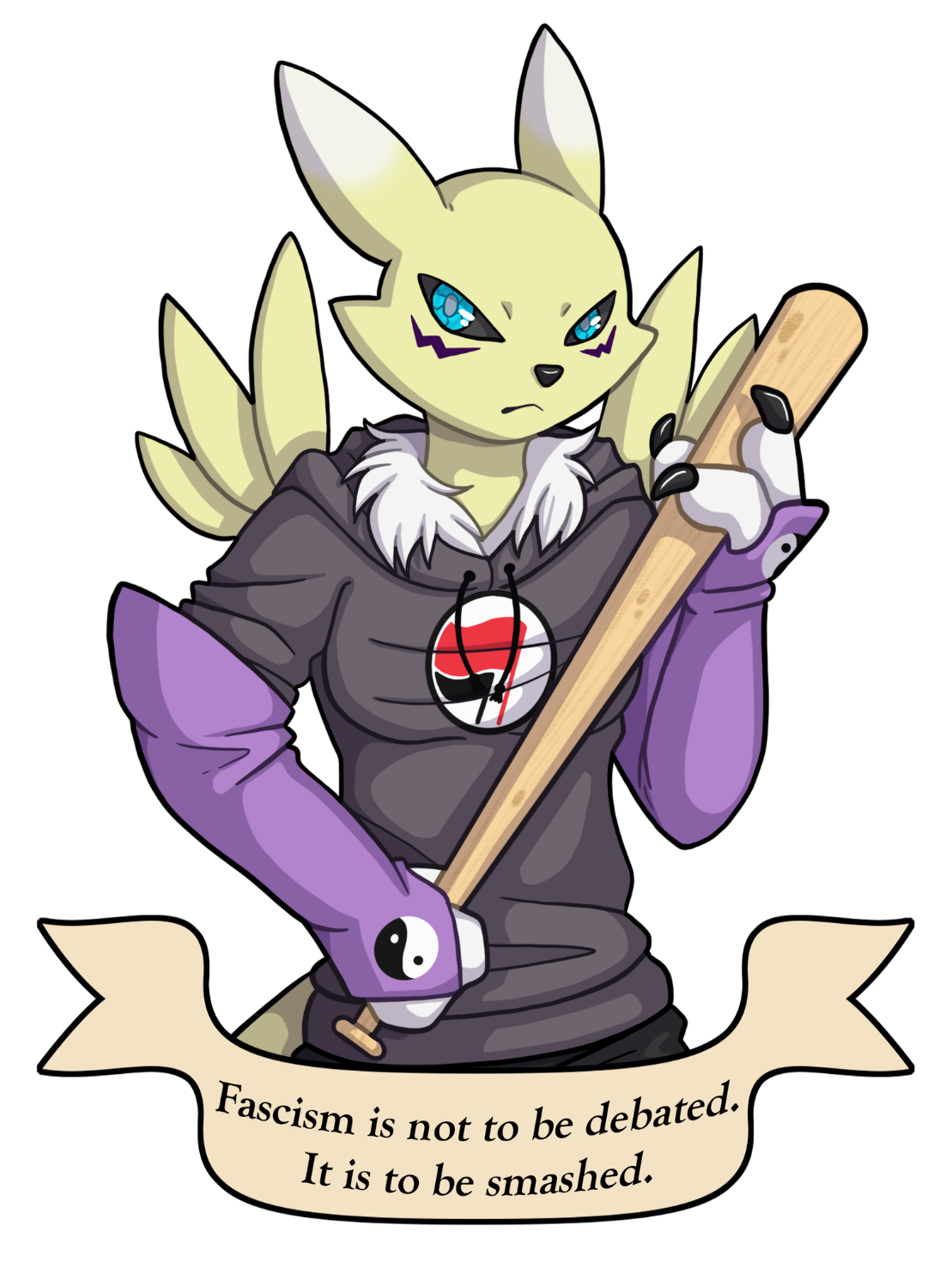 my secondary character, Melissa Archer, a robotic Renamon. she is wearing a charcoal grey hoodie with her purple renamon gloves pulled over the sleeves. on the front is the red and black symbol for Antifascist Aktion. she is holding a bat and holding the head of it with her other hand, and is also looking very angry. beneath the image, a banner reads "fascism is not to be debated. it is to be smashed."
