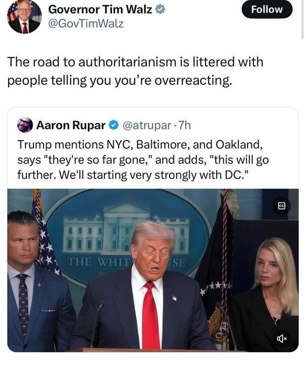 A screenshot of two X posts. The first post by Governor Tim Walz (@GovTimWalz ) states, "The road to authoritarianism is littered with people telling you you're overreacting," with a profile picture and verification badge. The second post by Aaron Rupar (@atrupar ), 7 hours ago, quotes Trump mentioning NYC, Baltimore, and Oakland, saying "they're so far gone," and adding, "this will go further. We'll starting very strongly with DC," accompanied by a video still showing Trump speaking at a podium with the White House seal, flanked by two individuals, with a U.S. flag and another flag in the background.