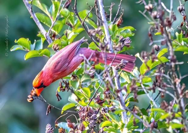 "A northern cardinal, brilliant and bold, is caught in the instant before flight. Perched on a slender branch surrounded by lush green leaves and dried seed pods, the bird leans forward with intent. Its body angles downward, wings slightly parted—not yet spread wide, but poised for motion. The cardinal’s plumage is a blaze of red, glowing against the soft blur of green and brown in the background. A black mask frames its beak and eyes, giving its face a sharp, expressive contrast. The beak itself is thick and orange-red, slightly open as if mid-breath or mid-call. The tail feathers trail behind, rigid and aligned, adding to the sense of aerodynamic readiness. Every detail—the tension in its posture, the curve of its claws gripping the branch, the tilt of its head—suggests imminent movement. It’s a moment suspended between stillness and flight, where instinct and gravity meet in quiet drama." - Copilot