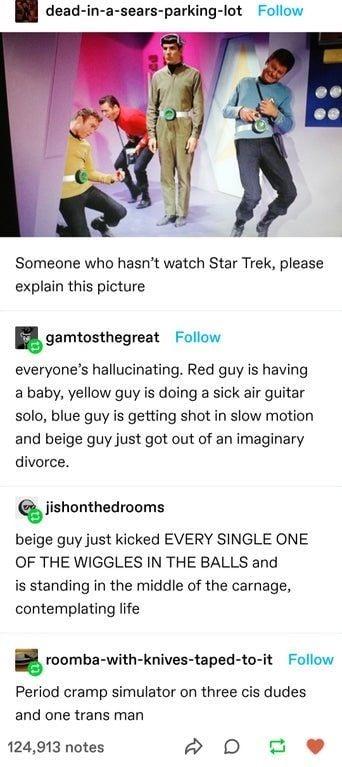 A picture from Spock's Brain in the form of a... We'll call it a mastodon post and replies ;^) Spock Standing still in the background, while Kirk, Scotty, and McCoy look like they're in pain Someone who hasn't watch Star Trek, please explain this picture ### gemtosthegreat ### everyone's hallucinating. Red guy is having a baby, yellow guy is doing a sick air guitar solo, blue guy is getting shot in slow motion and beige guy just got out of an imaginary divorce. ###ishonthedrooms ### beige guy just kicked EVERY SINGLE ONE OF THE WIGGLES IN THE BALLS and is standing in the middle of the carnage, contemplating life ### roomba-with-knives-taped-to-it ### Period cramp simulator on three cis dudes and one trans man