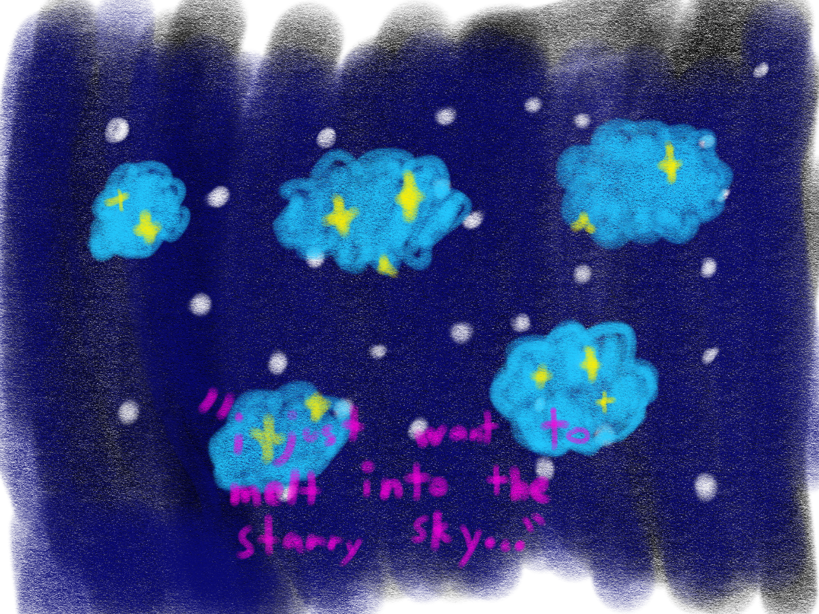 a crayon-y drawing, of a night sky with white dots for stars in front of the night sky, there are cloud-shaped areas, containing blue sky, as well as yellow diamond-shaped stars there is pink text in quotes that says "i just want to melt into the starry sky..."