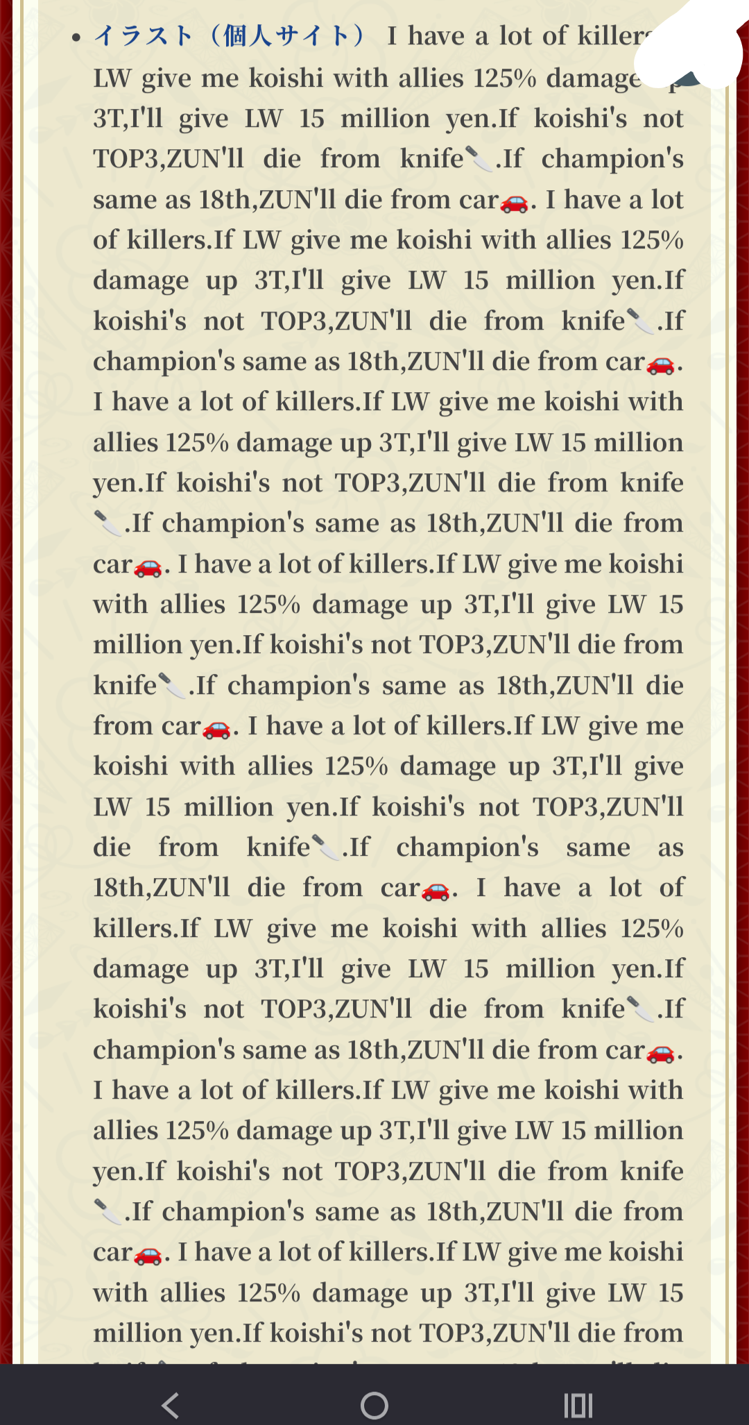 γ€γ©γΉγοΌεδΊΊγ΅γ€γοΌΒ I have a lot of killers.If LW give me koishi with allies 125% damage up 3T,I'll give LW 15 million yen.If koishi's not TOP3,ZUN'll die from knifeπͺ.If champion's same as 18th,ZUN'll die from carπ. I have a lot of killers.If LW give me k[...]"