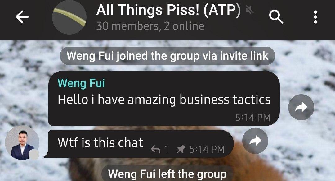 A spammer called Weng Fui with a business suit avatar joins a Telegram group and says "Hello I have amazing business tactics". He noticed that the group is called "All Things Piss!" He says "wtf is this chat" and then instantly leaves the group.