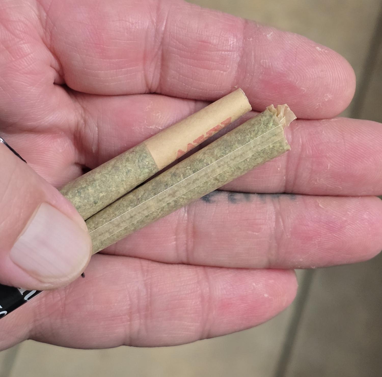 Two pre roll joints in the palm of my hand.