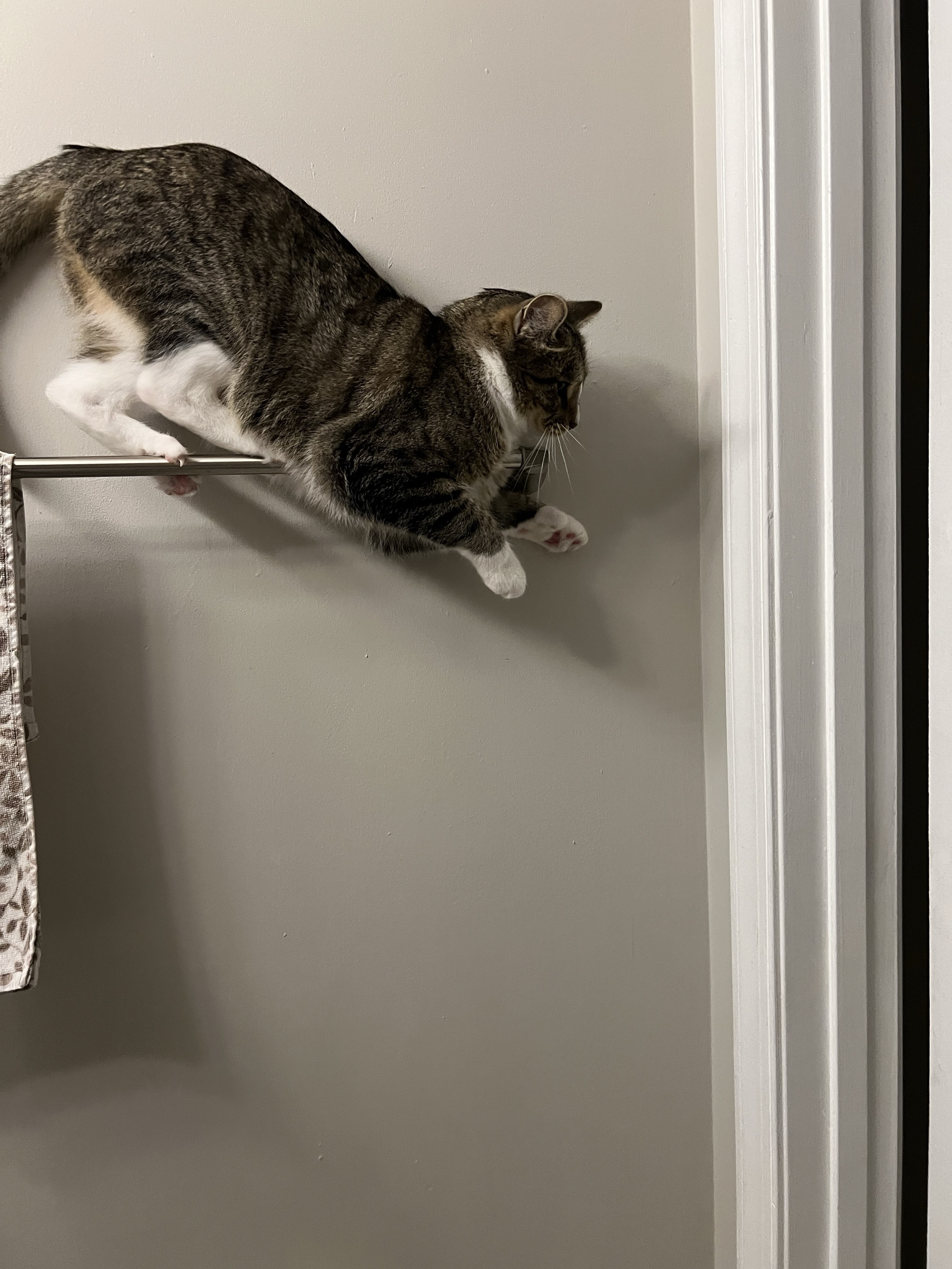 Photo of a tabby cat with white paws laying on the towel bar. Having recovered the back leg, a front leg has fallen through.