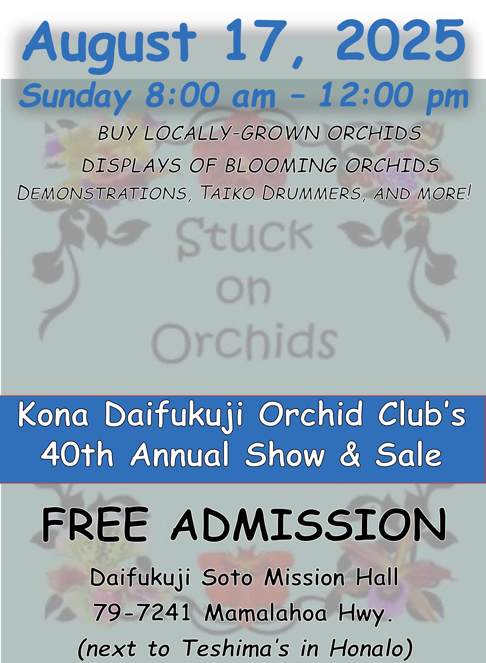 This is a screenshot from a Daifukuji e-mail. Over a colorful background the image says "August 17, 2025... Sunday 8 am to 12 pm... buy locally-grown orchids... displays of blooming orchids... demonstrations, taiko drummers, and more! Stuck on orchids, Kona Daifukuji Orchid Club's 40th annual show and sale... free admission... Daifukuji Soto Mission Hall... 79-7241 Mamalahoa Hwy... (next to Teshima's in Honalo)."