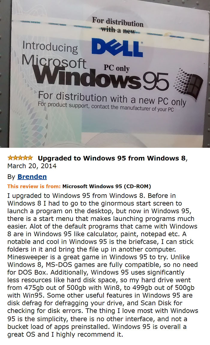 Picture of the Windows 95 startup screen, with the text: Upgraded to Windows 95 from Windows 8, March 20, 2014 By Brenden This review is from: Microsoft Windows 95 (CD-ROM) I upgraded to Windows 95 from Windows 8. Before in Windows 8 I had to go to the ginormous start screen to launch a program on the desktop, but now in Windows 95, there is a start menu that makes launching programs much easier. Alot of the default programs that came with Windows 8 are in Windows 95 like calculator, paint, notepad etc. A notable and cool in Windows 95 is the briefcase, I can stick folders in it and bring the file up in another computer. Minesweeper is a great game in Windows 95 to try. Unlike Windows 8, MS-DOS games are fully compatible, so no need for DOS Box. Additionally, Windows 95 uses significantly less resources like hard disk space, so my hard drive went from 475gb out of 500gb with Win8, to 499gb out of 500gb with Win95. Some other useful features in Windows 95 are disk defrag for defragging your drive, and Scan Disk for checking for disk errors. The thing I love most with Windows 95 is the simplicity, there is no other interface, and not a bucket load of apps preinstalled. Windows 95 is overall a great OS and I highly recommend it.