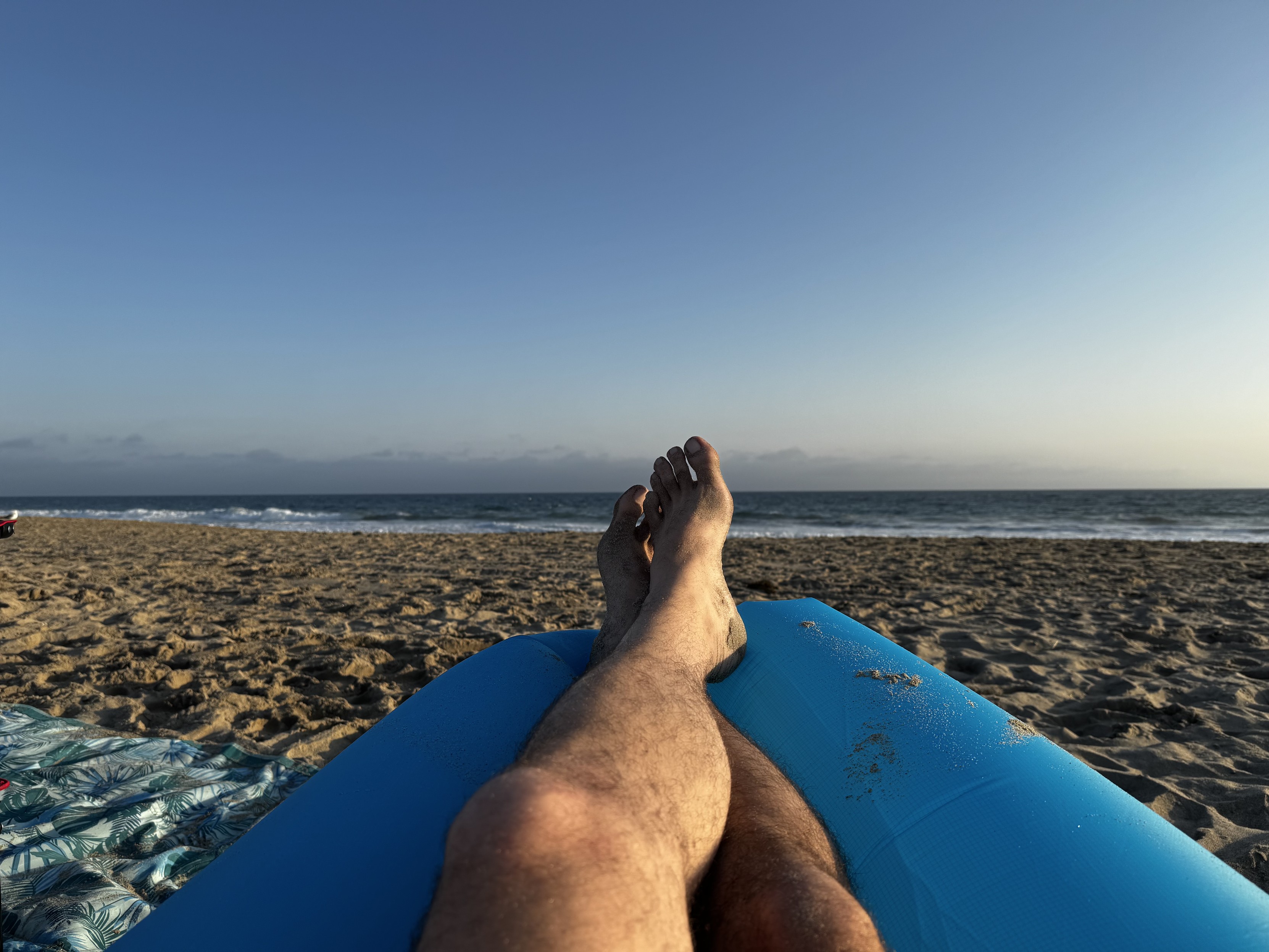 POV: laying down on an inflatable lounger on the sand, legs and feet in the picture facing the ocean at sunset