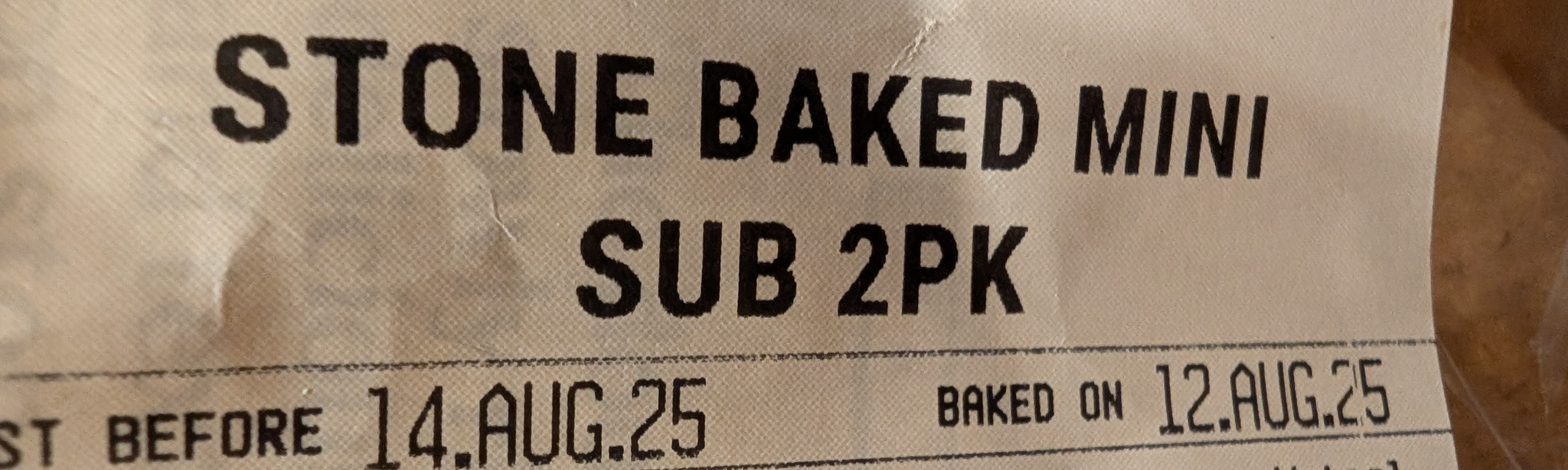 Cropped photo of food package label which reads: "STONE BAKED MINI SUB 2PK" "[BE]ST BEFORE 14.AUG.25" - "BAKED ON 12.AUG.25"