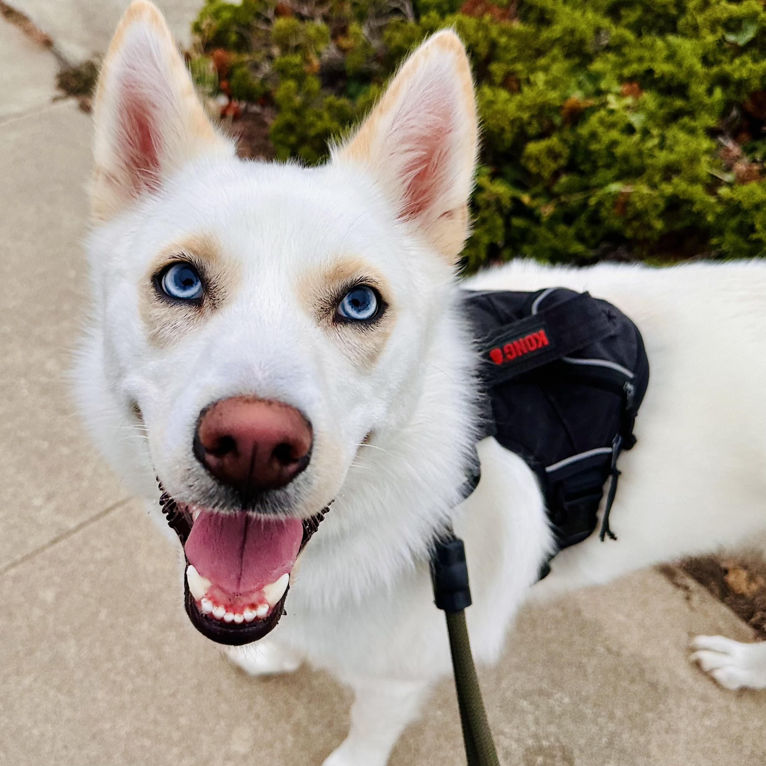 A photo of a beautiful white husky mix dog with beautiful blue eyes looking at me for a treat with a silly smile