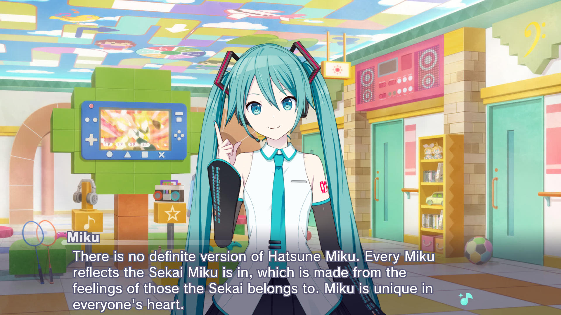 Made from Project Sekai's story board, in a toy house, Hatsune Miku says "There is no definite version of Hatsune Miku. Every Miku reflects the Sekai Miku is in, which is made from the feelings of those the Sekai belongs to. Miku is unique in everyone's heart."