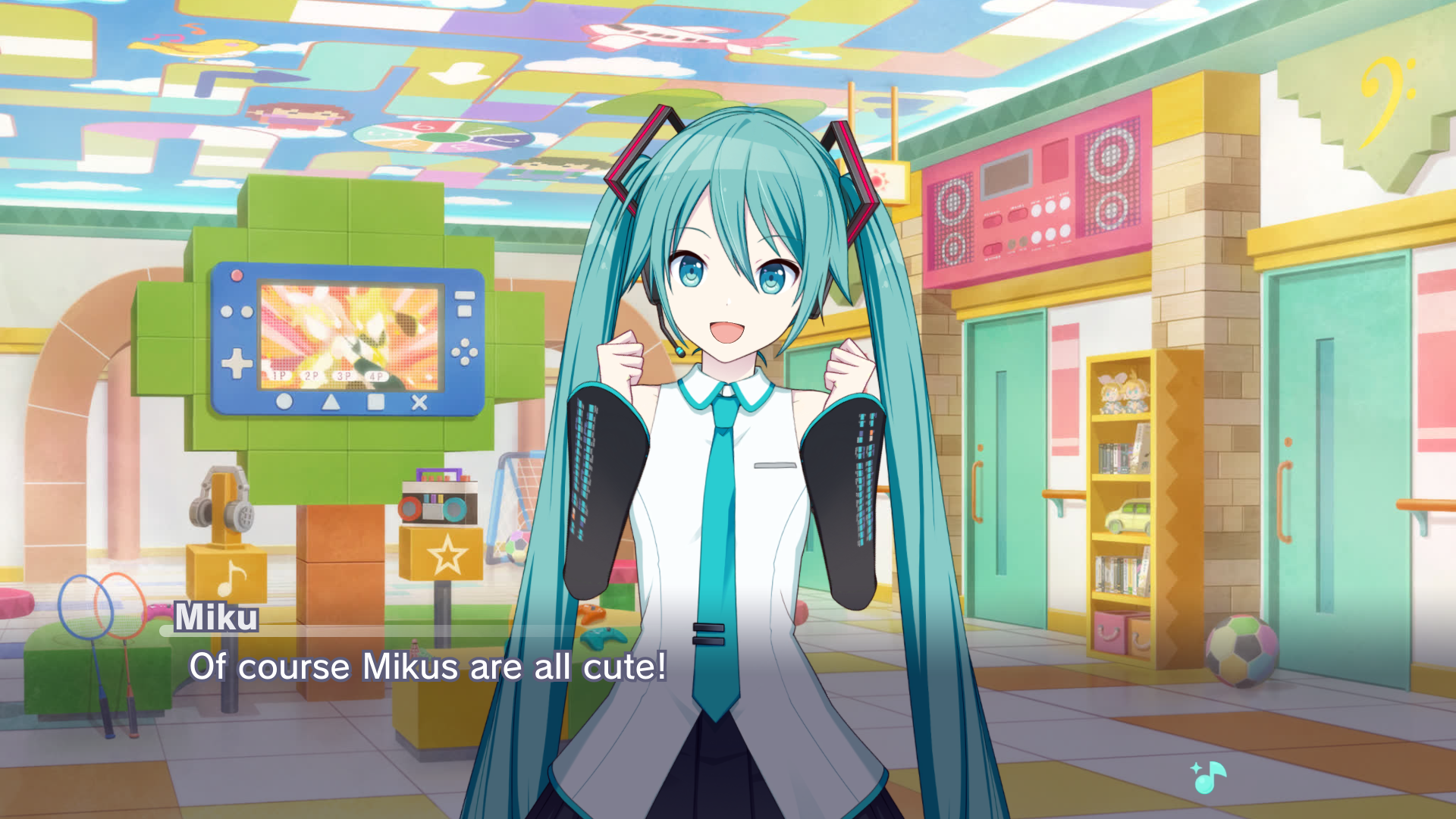 Made from Project Sekai's story board, in a toy house, Hatsune Miku says "Of course Mikus are all cute!"