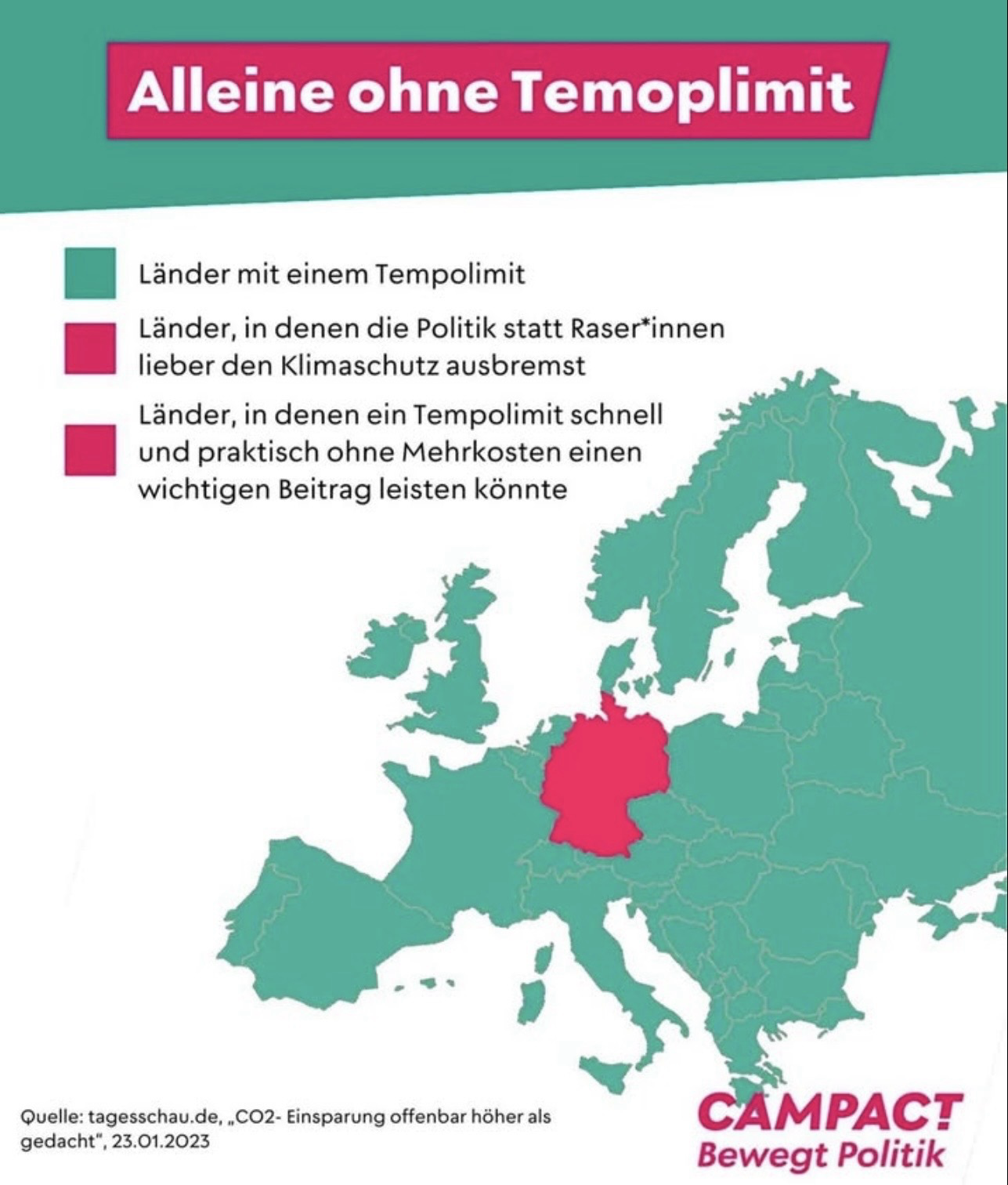 Europakarte: Deutschland als einziges Land rot markiert. Text: Alleine ohne Temoplimit: Deutschland Länder mit einem Tempolimit: alle anderen Länder, in denen die Politik statt Raser*innen lieber den Klimaschutz ausbremst Länder, in denen ein Tempolimit schnell und praktisch ohne Mehrkosten einen wichtigen Beitrag leisten könnte: alle anderen Quelle: tagesschau.de, _CO2- Einsparung offenbar höher als gedacht", 23.01.2023 CAMPACT Bewegt Politik