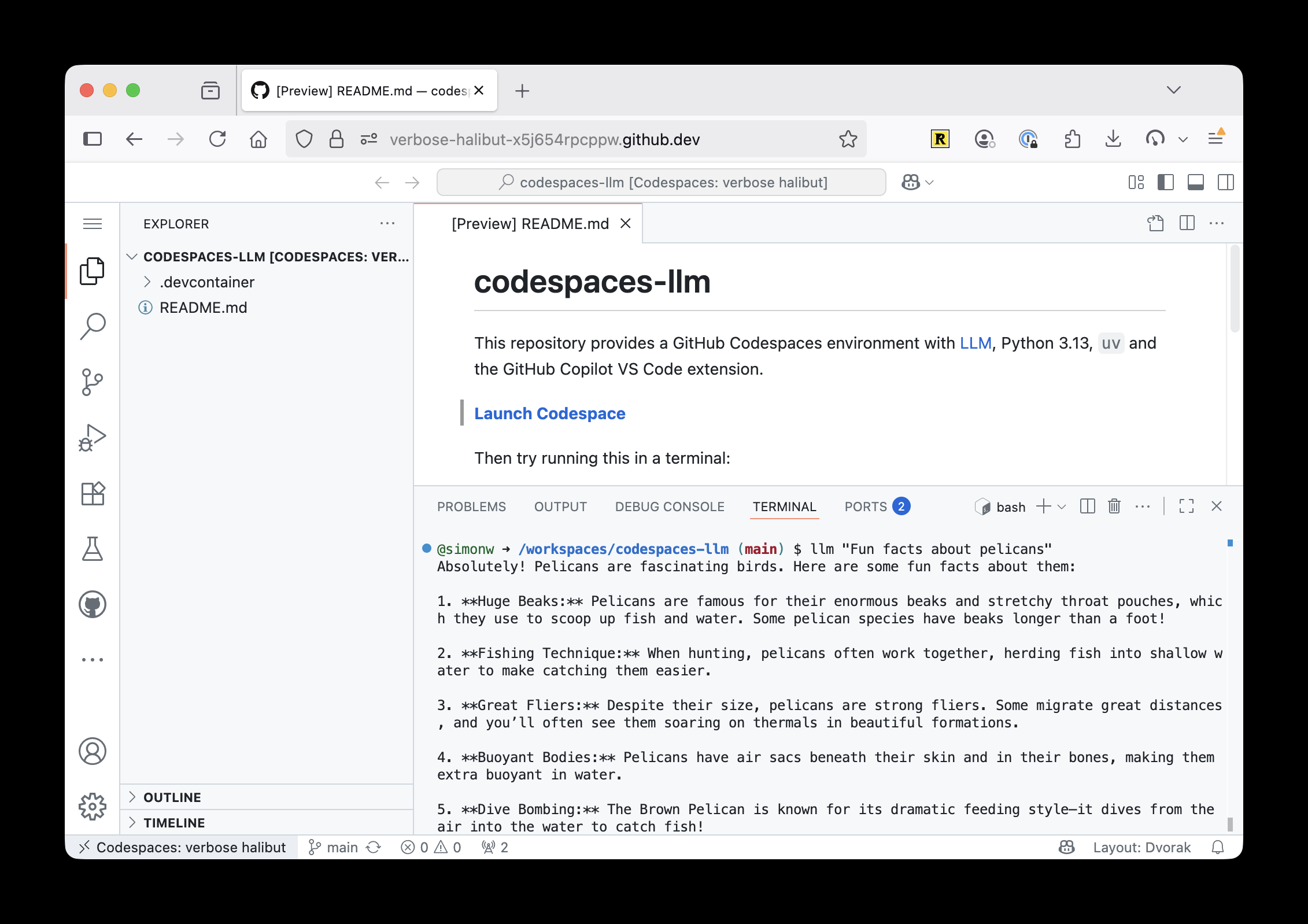 Screenshot of a GitHub Codespaces VS Code interface showing a README.md file for codespaces-llm repository. The file describes a GitHub Codespaces environment with LLM, Python 3.13, uv and the GitHub Copilot VS Code extension. It has a "Launch Codespace" button. Below shows a terminal tab with the command "llm 'Fun facts about pelicans'" which has generated output listing 5 pelican facts: 1. **Huge Beaks:** about their enormous beaks and throat pouches for scooping fish and water, some over a foot long; 2. **Fishing Technique:** about working together to herd fish into shallow water; 3. **Great Fliers:** about being strong fliers that migrate great distances and soar on thermals; 4. **Buoyant Bodies:** about having air sacs beneath skin and bones making them extra buoyant; 5. **Dive Bombing:** about Brown Pelicans diving dramatically from air into water to catch fish.