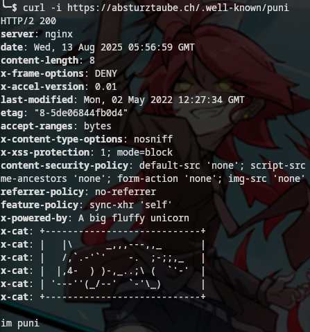curl of https://absturztaube.ch/.well-known/puni showing an ascii cat sleeping in the response headers. and the curl command is run in the kitty terminal