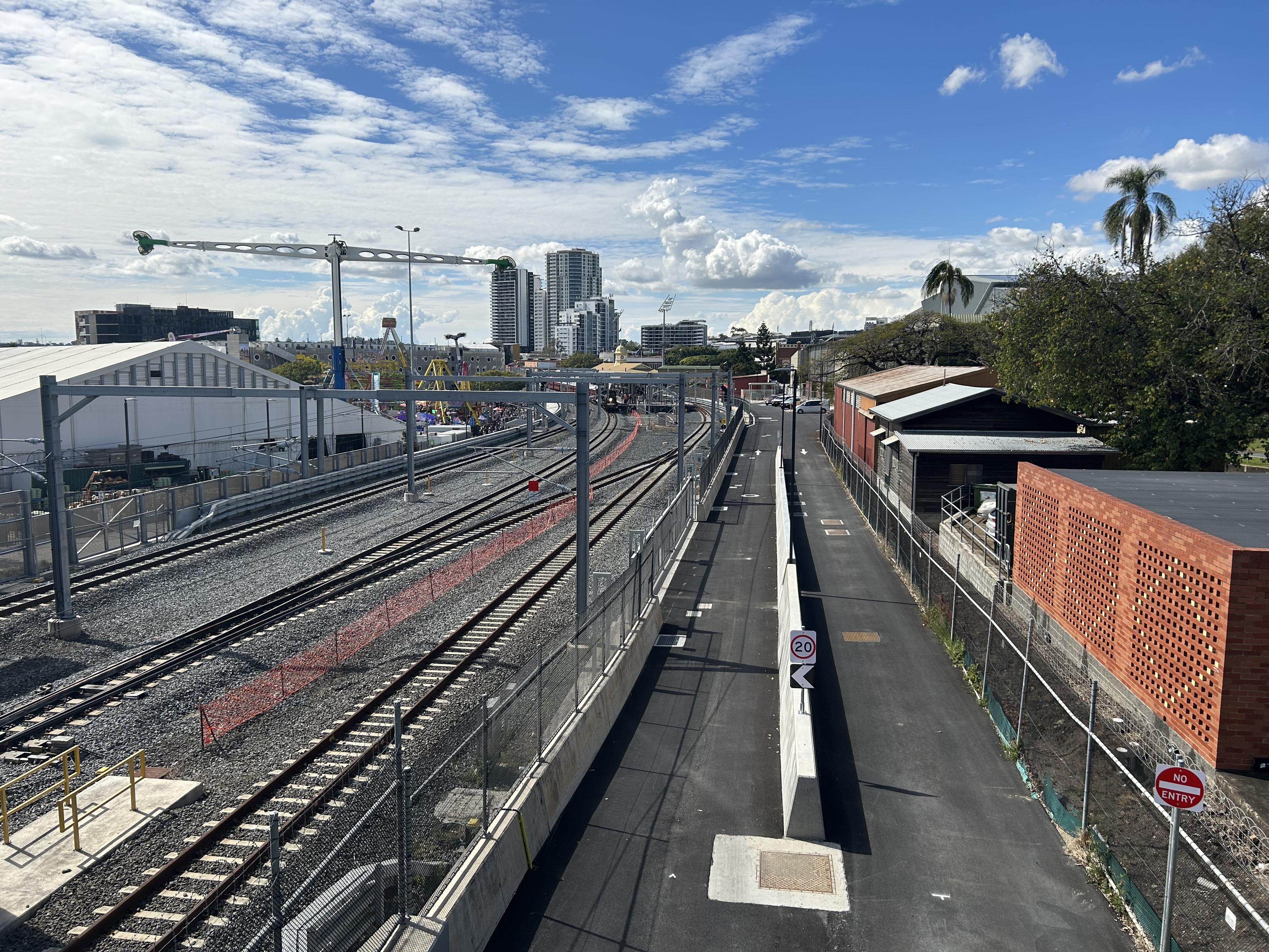 Photo taken of a green steam train standing at the station in the Brisbane exhibition grounds, the rides and pavilions of the show can be seen surrounding the tracks.