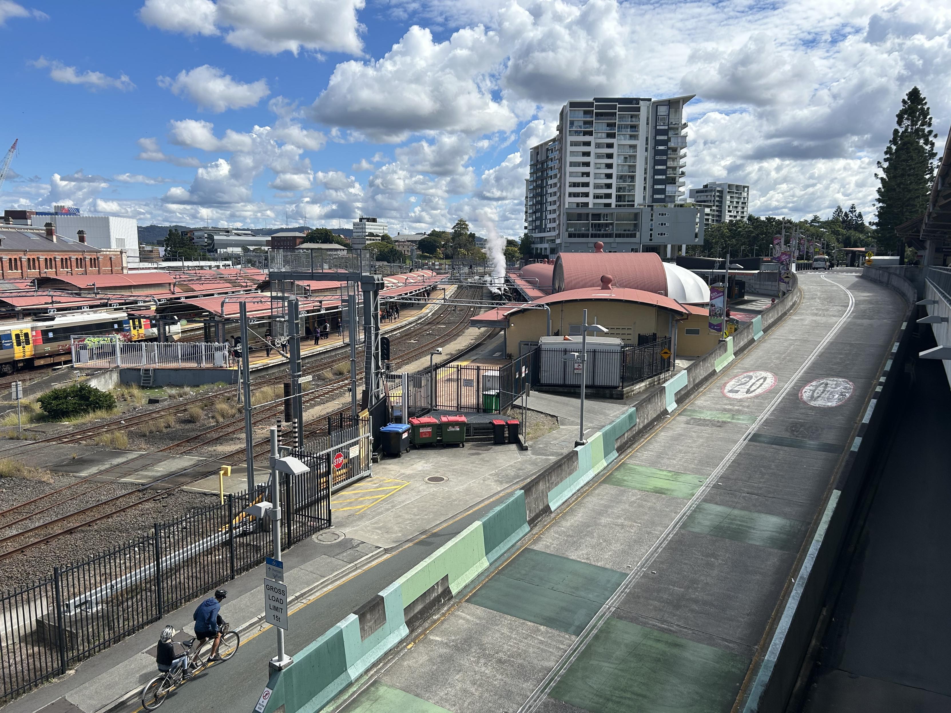 The same steam train is seen standing at platform ten of Roma Street station, views from a nearby overhead walkway.
