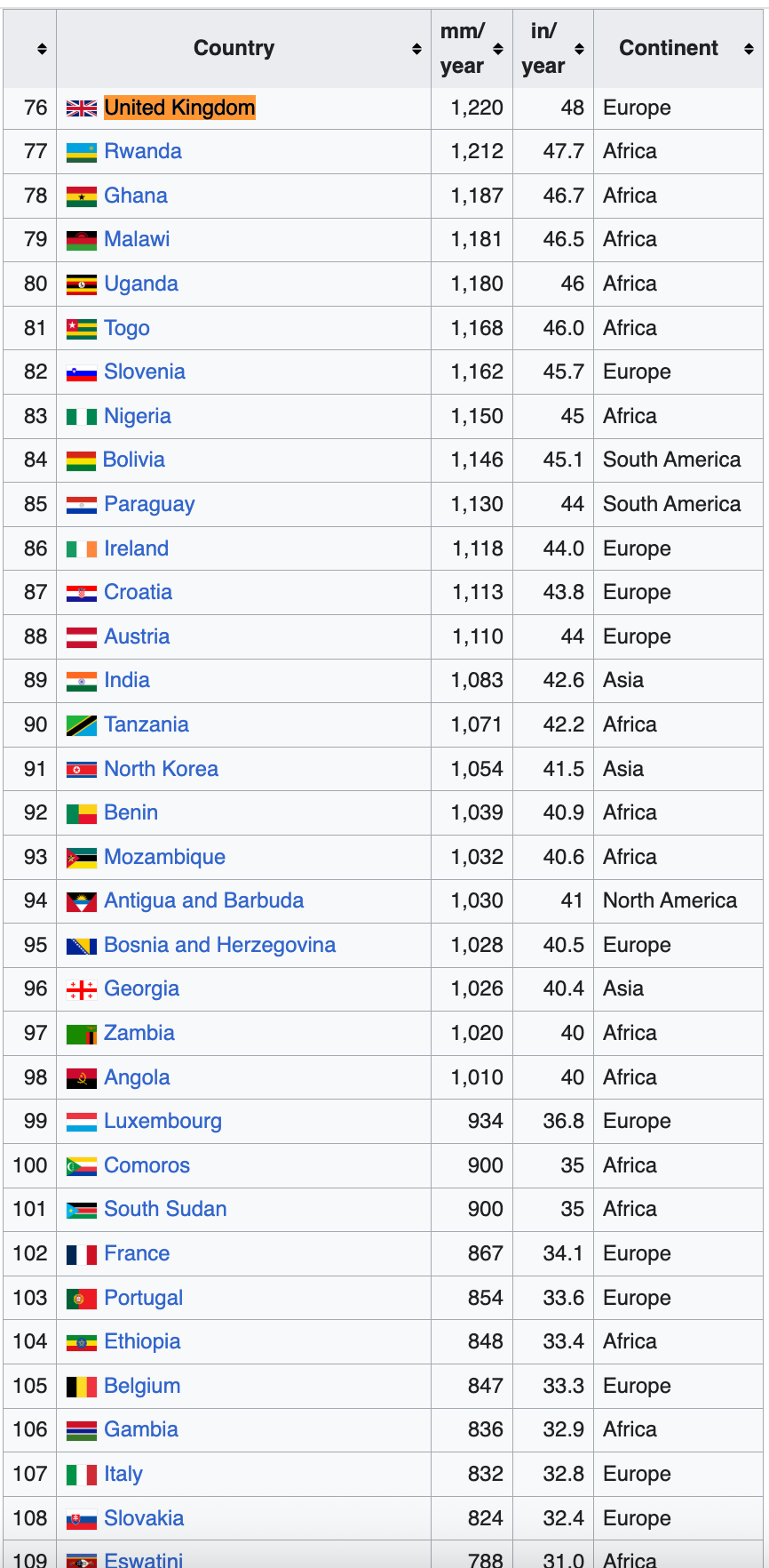 Screenshot der Tabelle https://en.wikipedia.org/wiki/List_of_countries_by_average_annual_precipitation