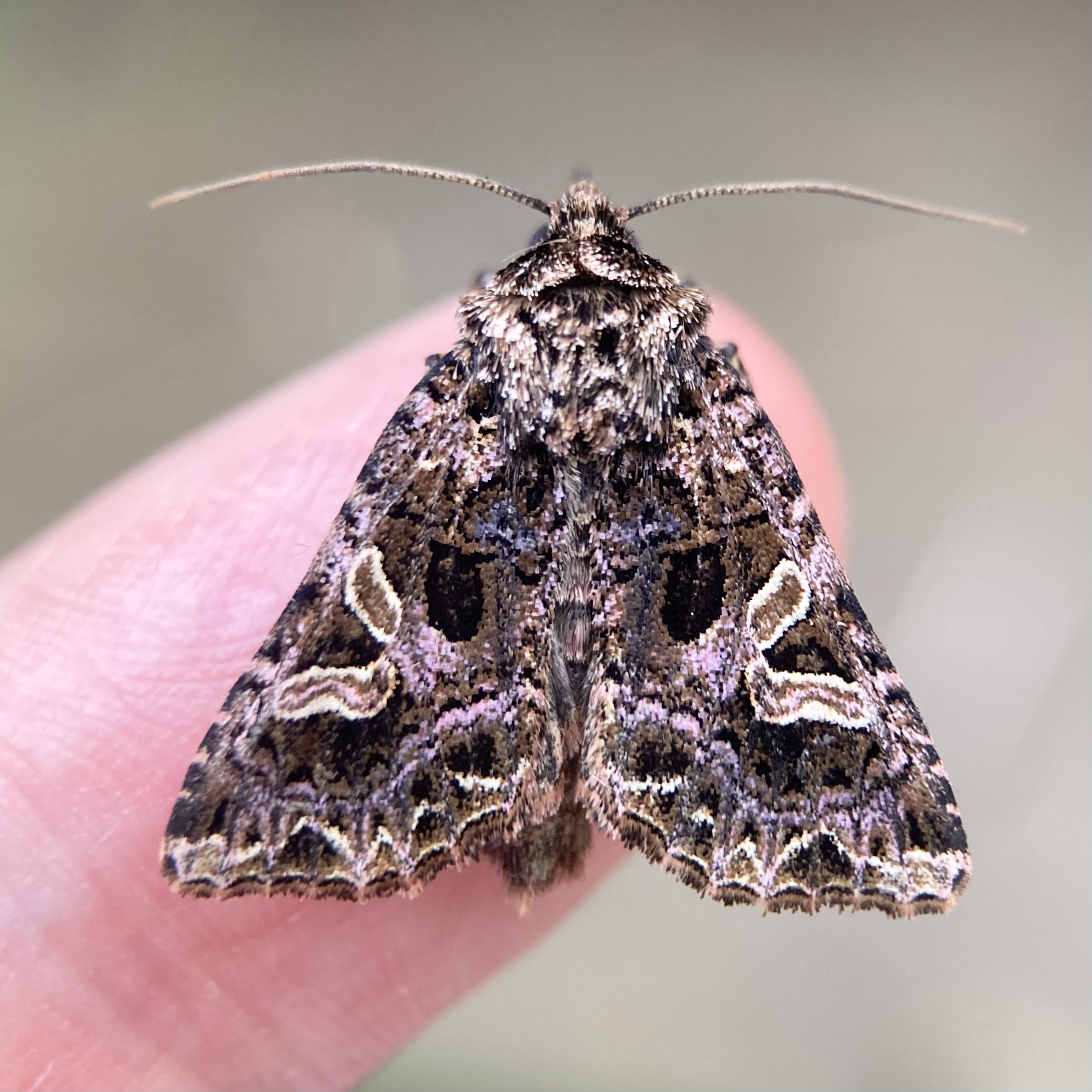 Overhead shot of a 1.5cm triangular moth on a finger. It has very busy markings. Primarily dark chestnut and flecks of white with bright pink or light purple suffusion coming through in vague wavy lines. There are two dark teeth-shaped mark on the wings either side of the abdomen and just below these, nearer the outer edges is a mirror image stigmata which is made of two rectangles of chestnut edged in white. They are joined at one corner so it resembles an angled L, (i.e. the horizontal is straight but the vertical is angled at 45 degrees). It has two thin, wiry antannae