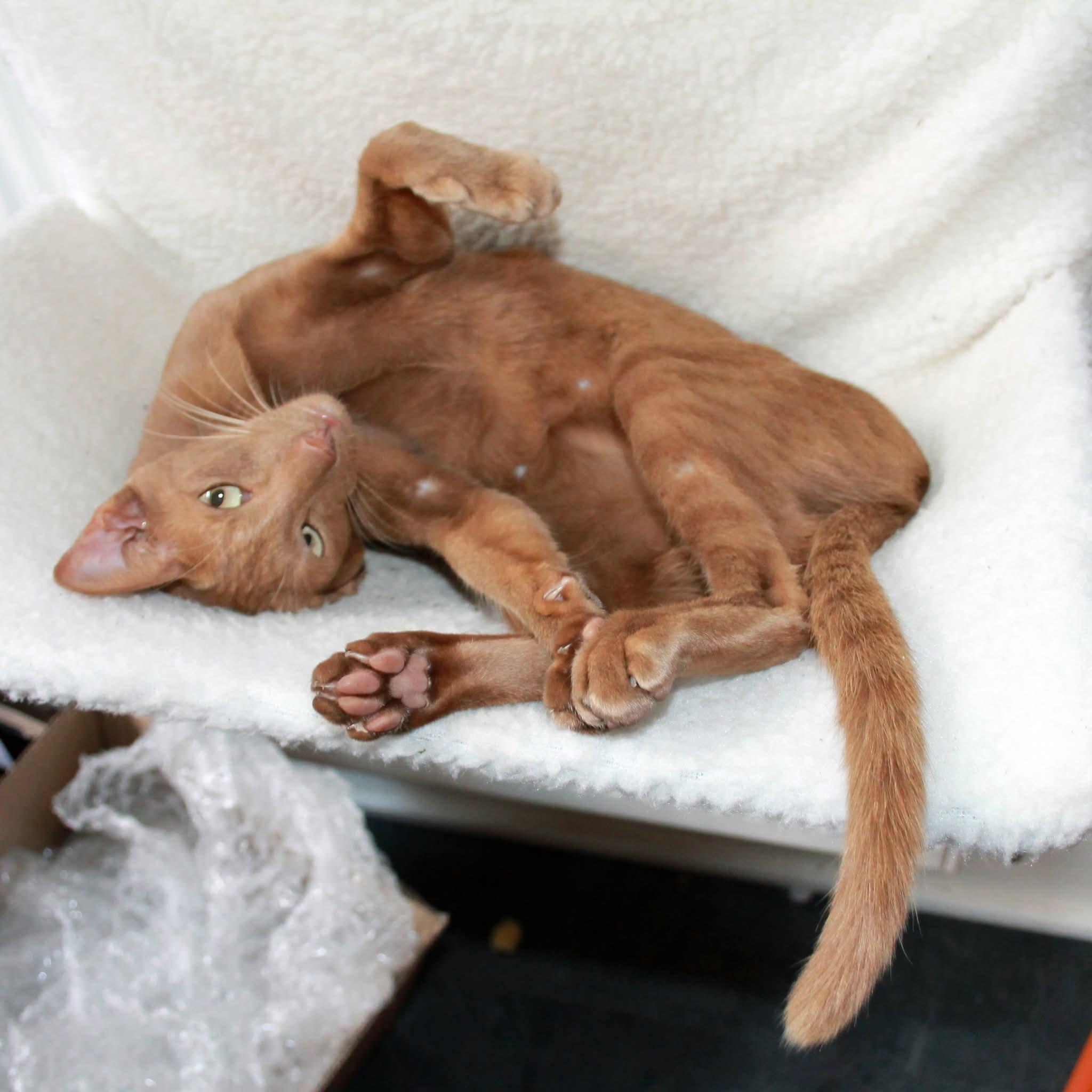 A small brown cat, in a tangle of limbs in a radiator bed, looking at Tue camera with her head upside down.