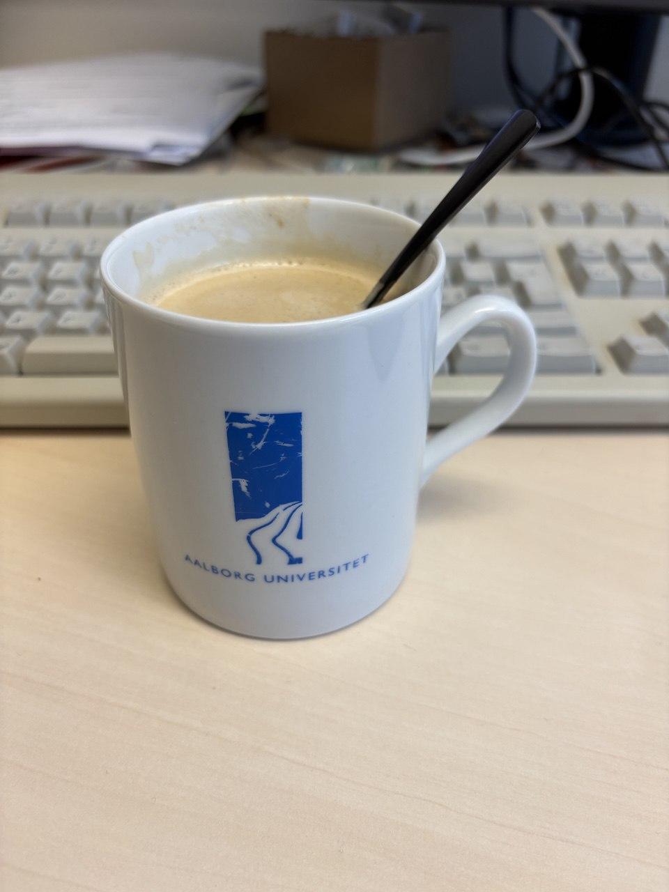 A coffee mug with the name and (old?) logo of Aalborg universitet in Denmark sitting on my desk in front of a 35 year old Apple Extended Keyboard II, which I'm using (with an ADB-to-USB converter) on my desk every day.