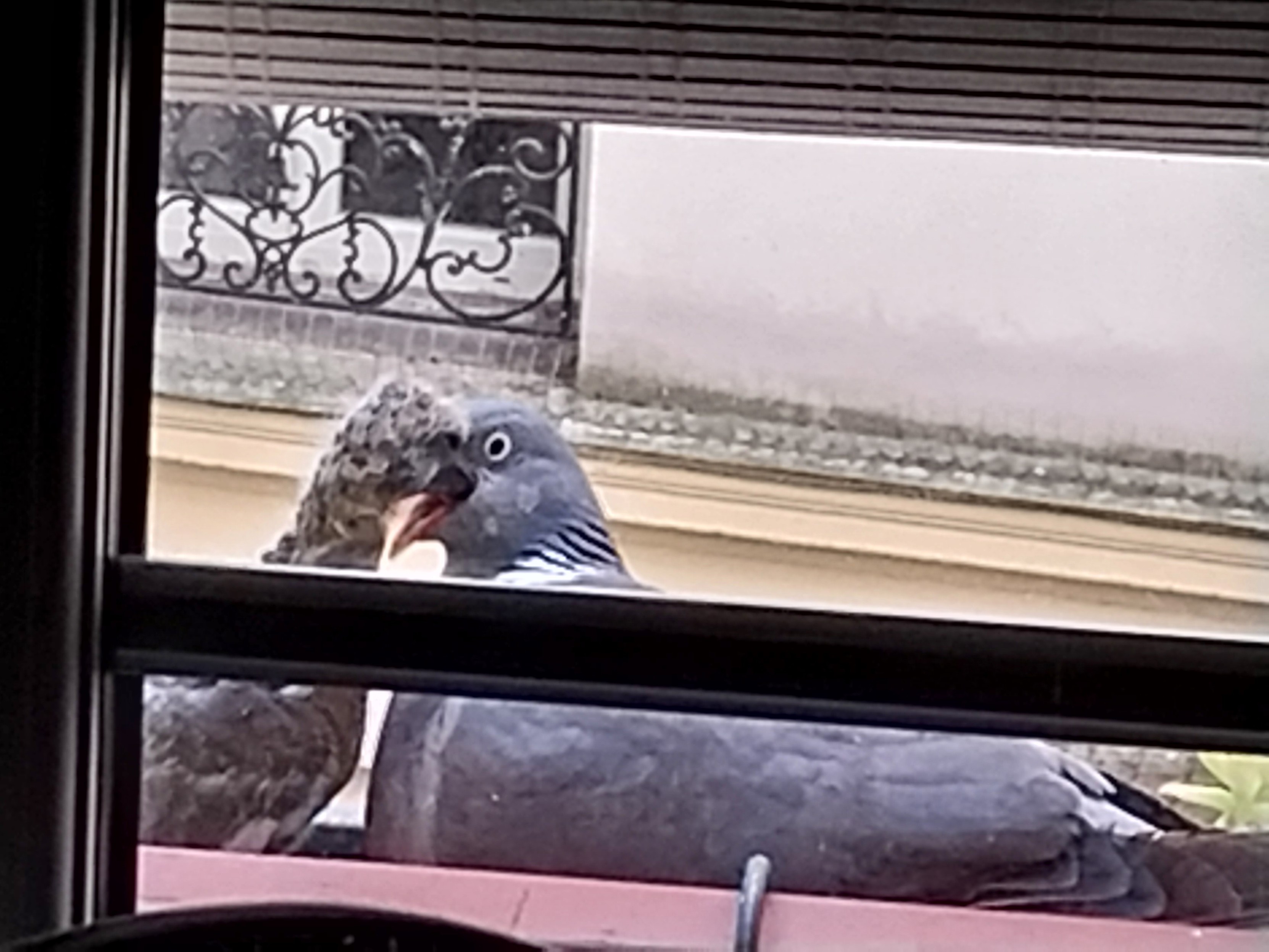 Photos trรจs zoomรฉe Un bรฉbรฉ pigeon gris et duveteux picore dans le bec grand ouvert de son parent