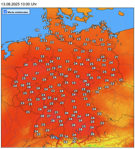 Deutschland-Karte mit den Temperaturen um 10 Uhr am 13.8.25. Die Werte liegen zwischen 20Β° C im Norden an der KΓΌsten und 28 Β° C im SΓΌden in Bayern.
