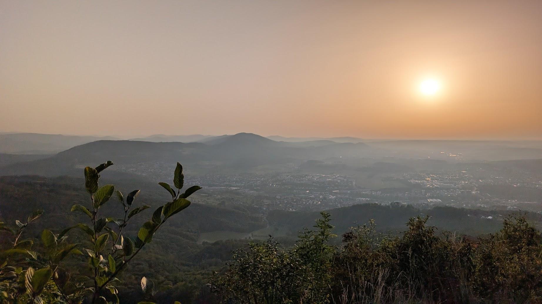 Photo of hills in the distance, close to sunset. The Sun is still a little up. There is a twig in the foreground. The sky is red-ish.