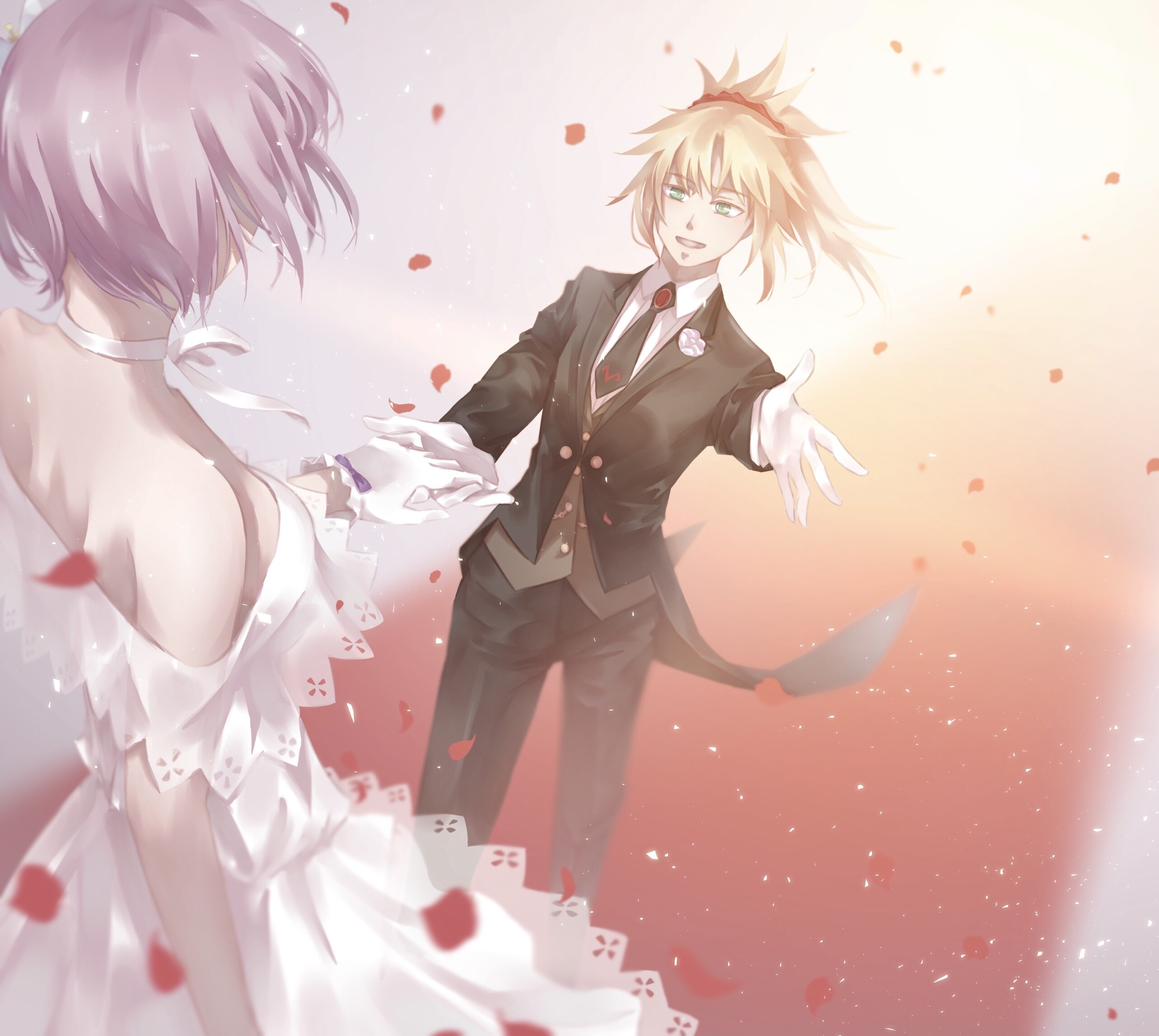 Danbooru tags: 2girls bad_id bad_pixiv_id bare_shoulders black_necktie blonde_hair braid bride collared_shirt commentary_request dress fate/grand_order fate_(series) flower formal_clothes french_braid from_behind gloves green_eyes hair_ornament hair_scrunchie highres holding_hands jacket long_sleeves looking_at_another mash_kyrielight mash_kyrielight_(formal_dress) mordred_(fate) mordred_(formal_dress)_(fate) multiple_girls necktie official_alternate_costume open_mouth petals ponytail purple_hair red_scrunchie scrunchie shirt short_hair smile strapless strapless_dress suit tsushima_touko wedding_dress white_dress white_gloves white_shirt wife_and_wife yuri