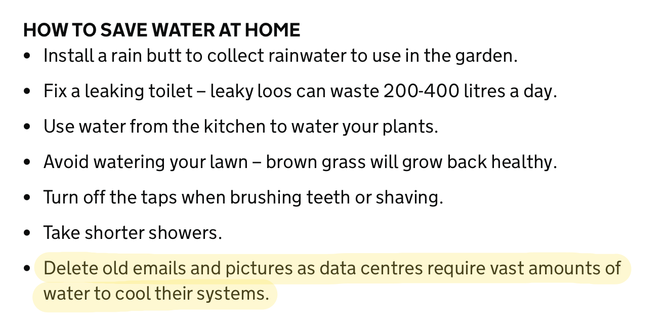 A screenshot from a government page about saving water. It says. HOW TO SAVE WATER AT HOME • Install a rain butt to collect rainwater to use in the garden. • Fix a leaking toilet - leaky loos can waste 200-400 litres a day. • Use water from the kitchen to water your plants. • Avoid watering your lawn - brown grass will grow back healthy. • Turn off the taps when brushing teeth or shaving. • Take shorter showers. • Delete old emails and pictures as data centres require vast amounts of water to cool their systems.
