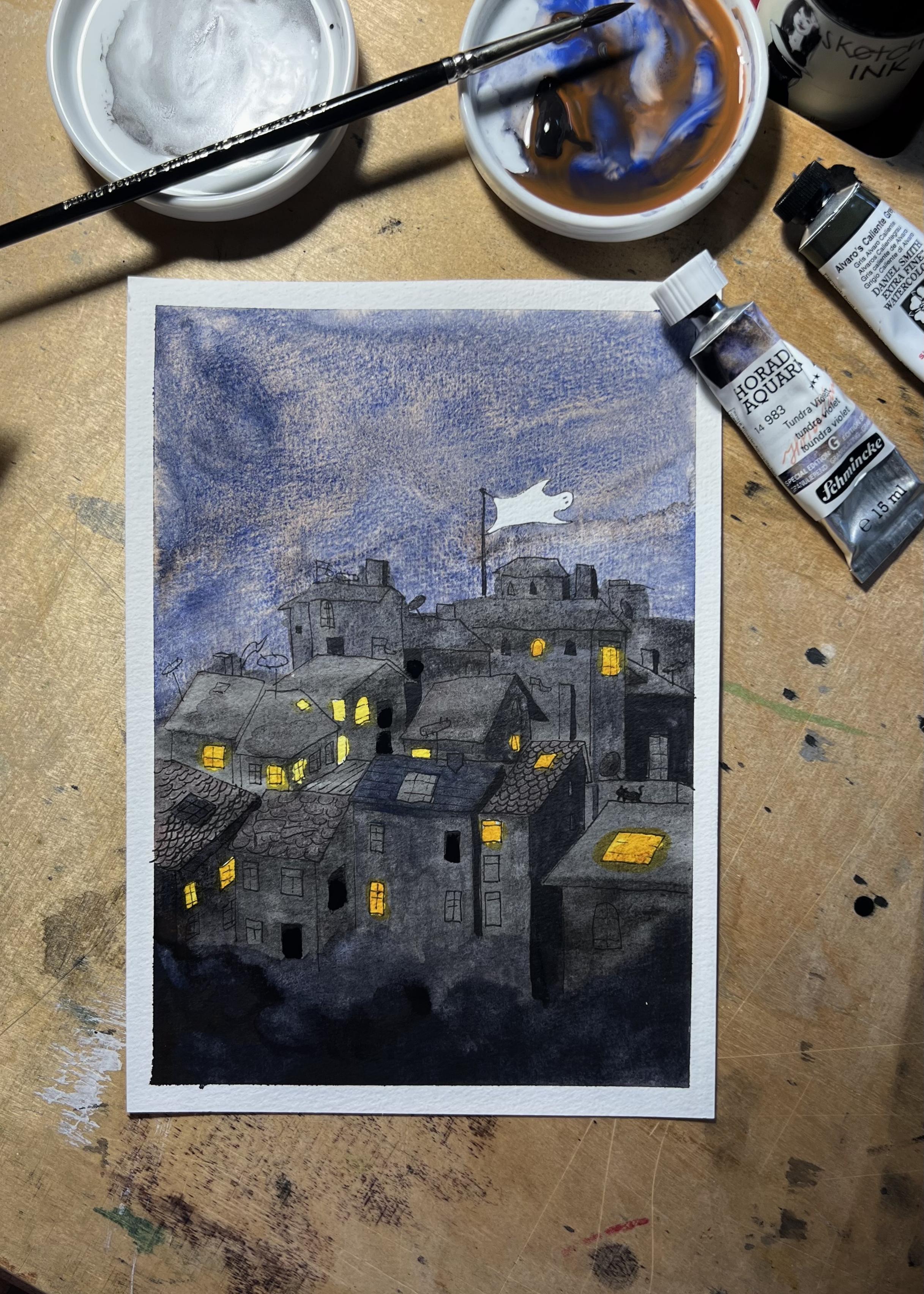 Aquarell einer nΓ€chtlichen Stadt. Das Gespenst weht wie eine Flagge vom Flaggenmast.