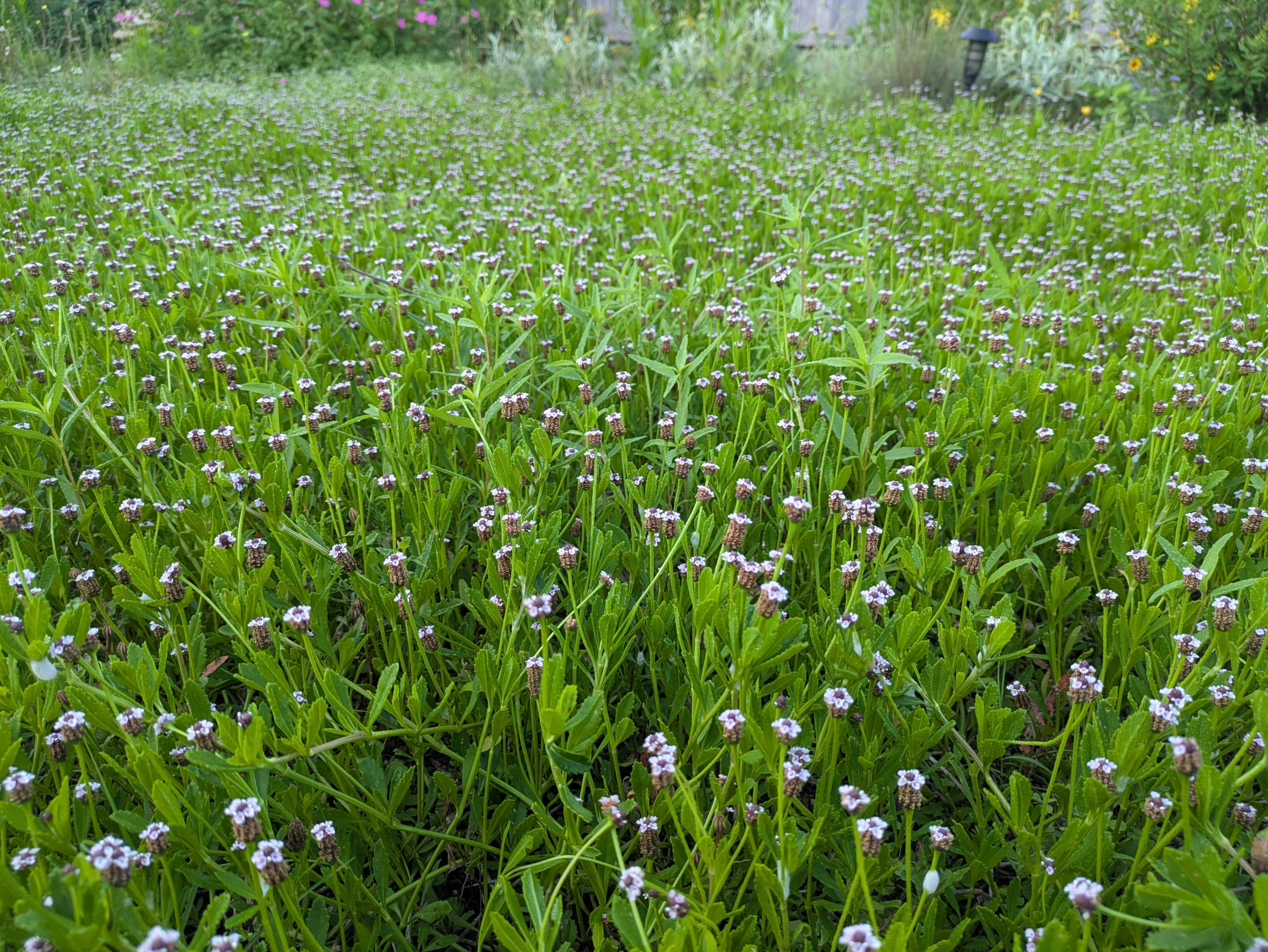 A lawn with blooming frogfruit both in foreground and background. The blooms are small, round and white with a little brownish cylinder coming out the bottom of some.