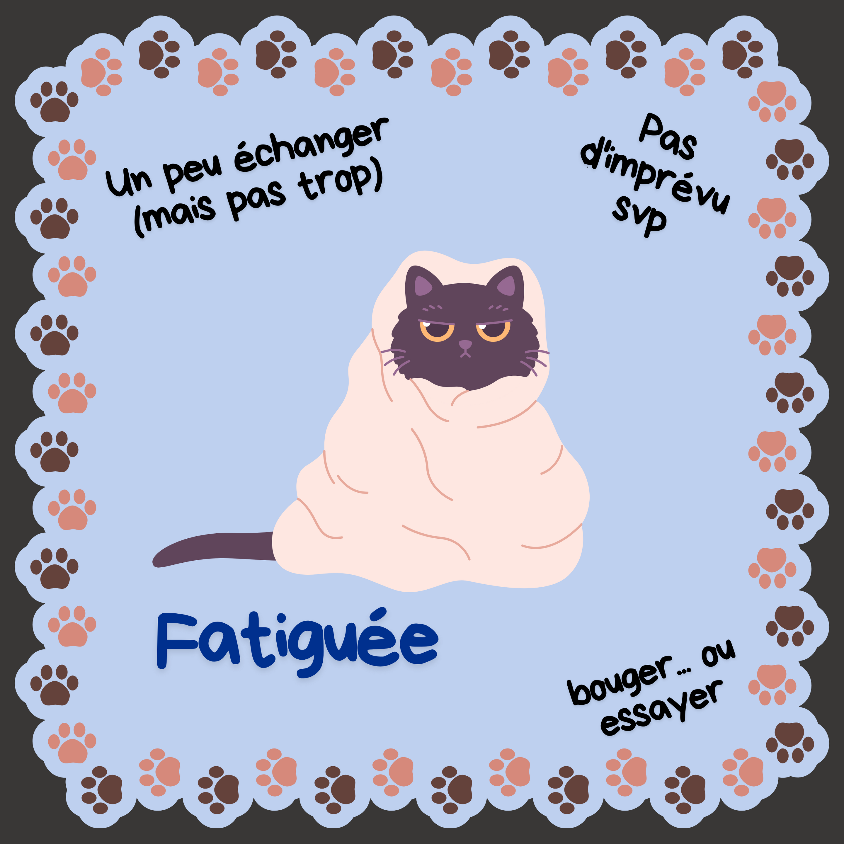 Illustration fatiguée : un chat fait la tronche dans un plaid. Autour, les phrases un peu échanger mais pas trop, bouger ou essayer, pas d'imprévu svp. Une bordure en traces de pattes autour.